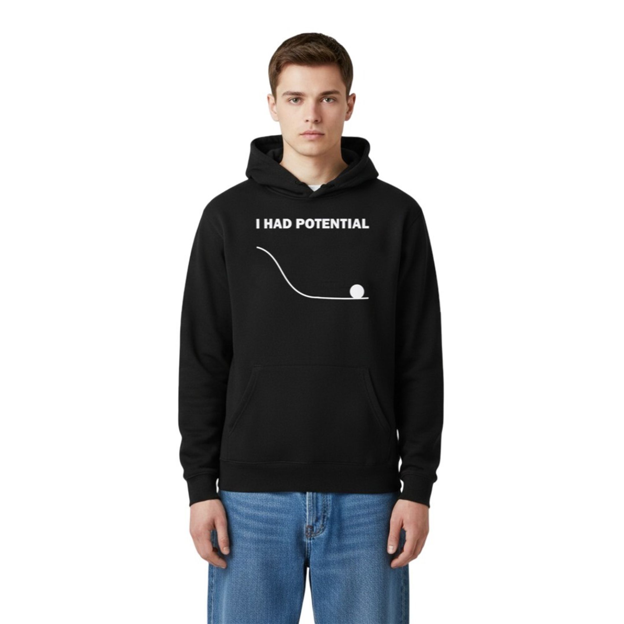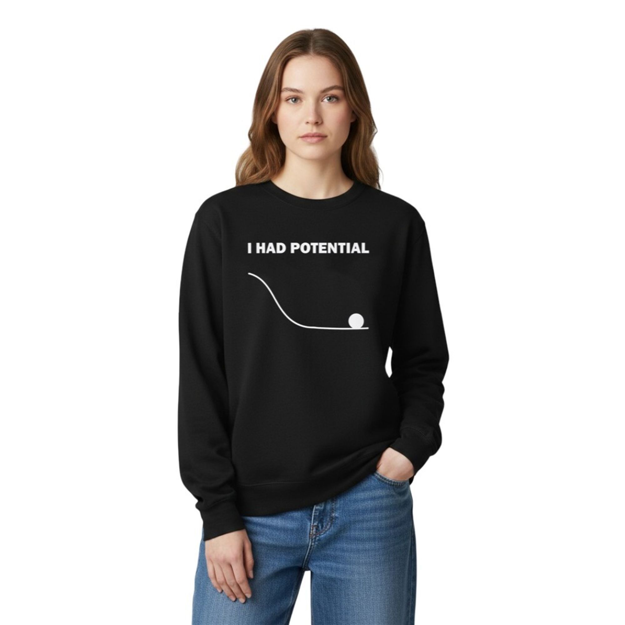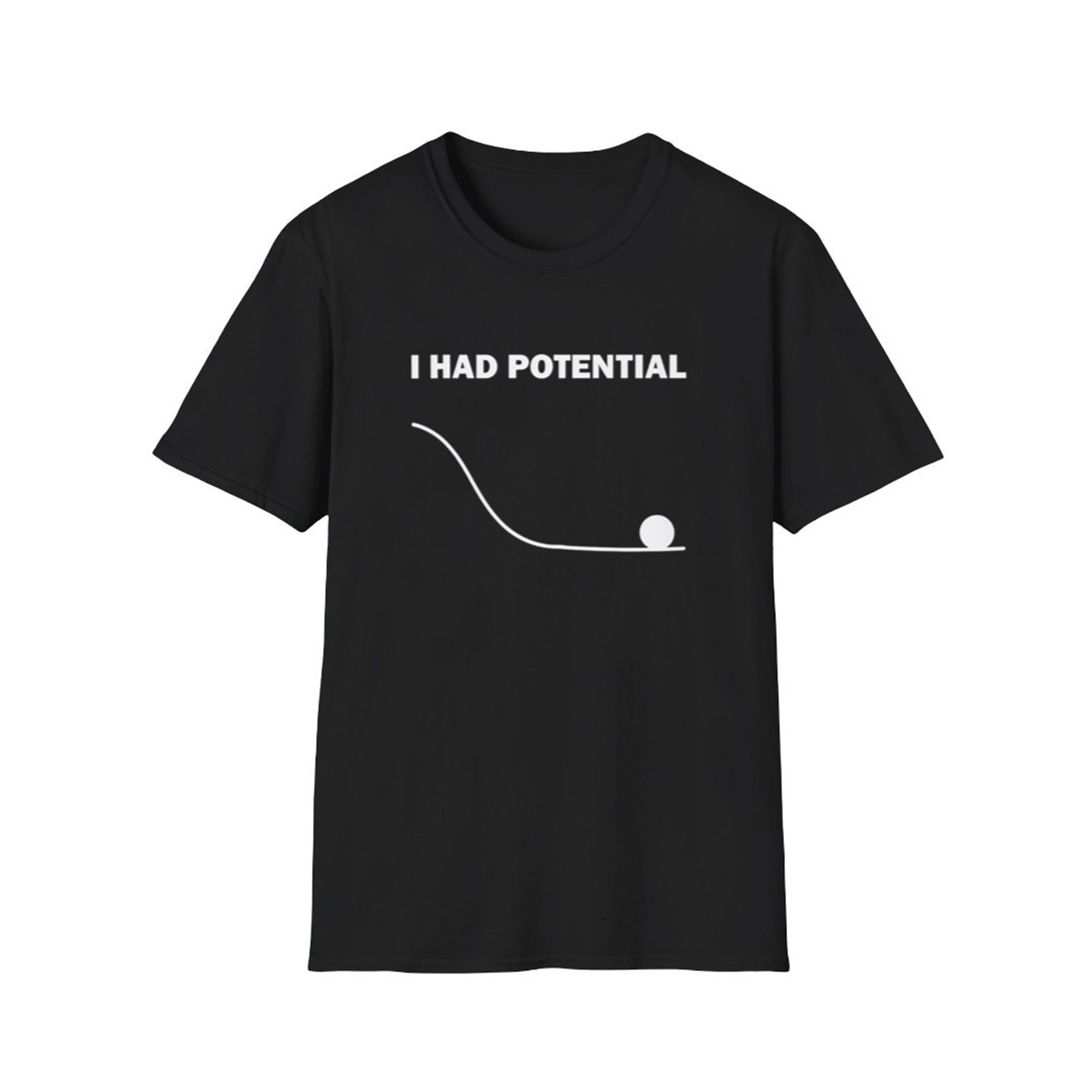 In the world of graphic apparel, few designs manage to capture the zeitgeist as effectively as this piece. At its core, the shirt features a crisp, high-contrast white graphic on a dark background, ensuring the joke lands visible from a distance. The design centers on a standard physics 101 diagram: a curve representing a slope with a ball resting at the bottom. Above it, the text reads “I HAD POTENTIAL.”