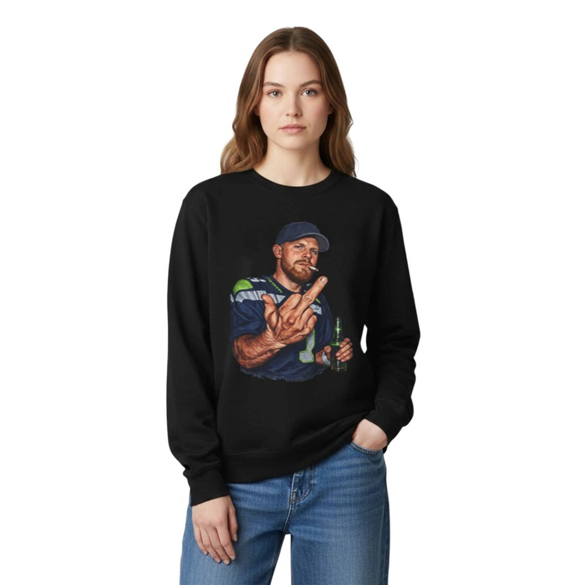The design centers on a stunningly detailed illustration of Sam Darnold donning the Seattle Navy and Green. The artwork captures a specific, gritty aesthetic reminiscent of vintage sports caricatures but with a modern, edgy twist. The imagery is unmistakable: the laid-back tilt of the cap, the casual grip on a green bottle, the lit cigarette that channels “Smokin’ Jay” energy, and, of course, the central focal point—the middle finger presented to the world.