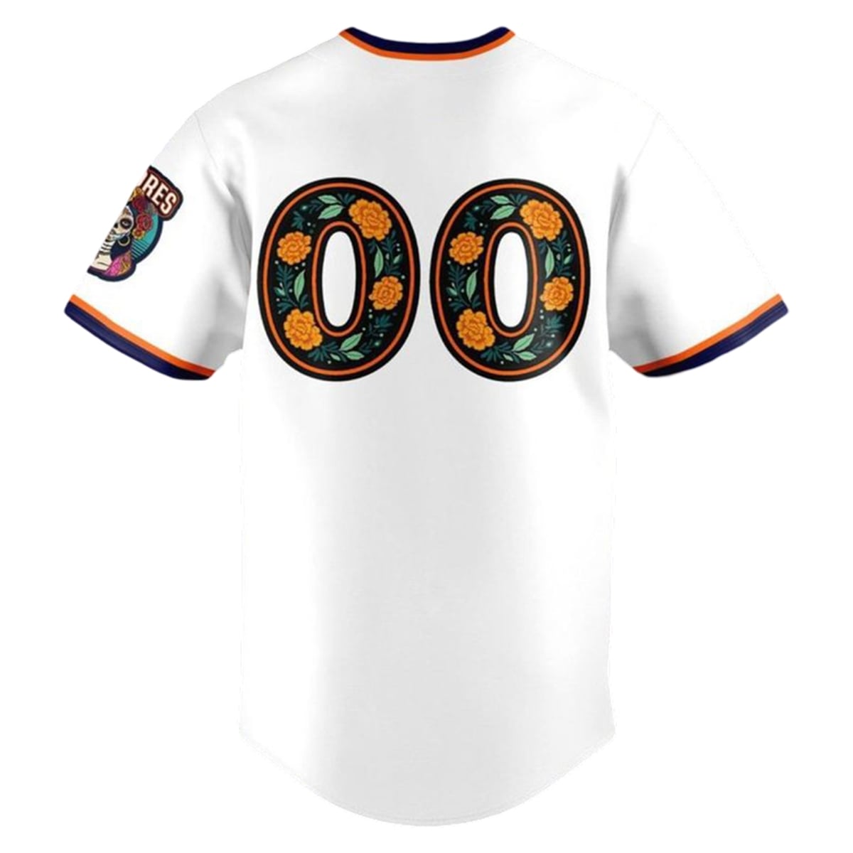 The jersey is a breathtaking departure from conventional sports uniforms. Set against a crisp, clean white background, the chest features the “SAN DIEGO” wordmark in a stylized, flowing purple font outlined in energetic orange. The visual centerpiece of the jersey lies in the numbering; the classic “00” is completely reimagined, filled with detailed illustrations of blooming orange marigolds and green foliage. Complementing this is the captivating sleeve patch, which showcases a traditional Calavera (sugar skull) adorned with floral motifs, positioned beneath the “PADRES” banner. Every visual element works in harmony to create a stunning, culturally rich aesthetic.
