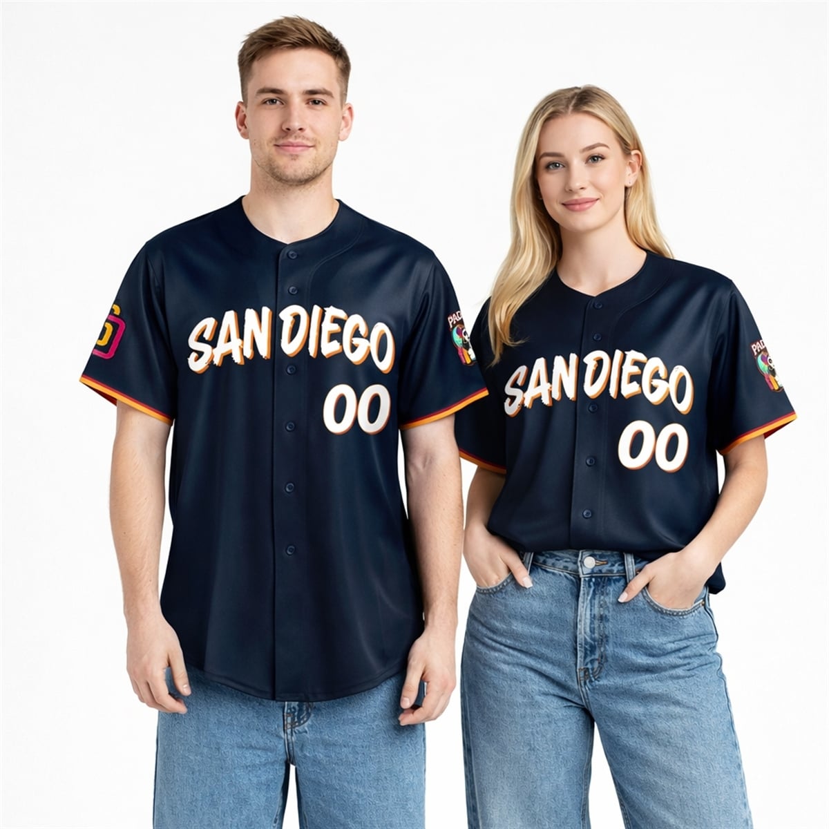 The jersey is a visual masterpiece that completely reimagines traditional team apparel. The primary base of the jersey is a deep, midnight navy, serving as the perfect dark backdrop to make the vibrant colors truly glow. Across the chest, “SAN DIEGO” is rendered in a highly stylized, brush-stroke font featuring stark white lettering outlined in fiery orange and red, evoking the feel of festive street art and cultural signage.