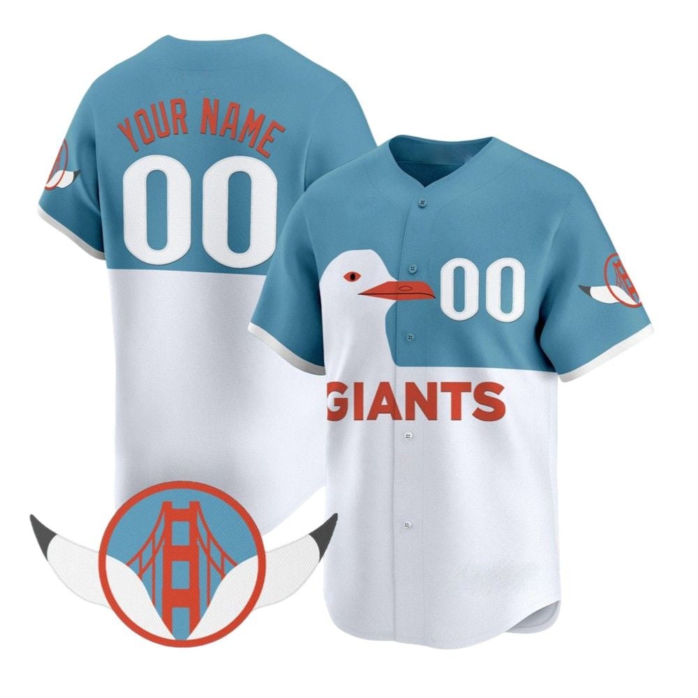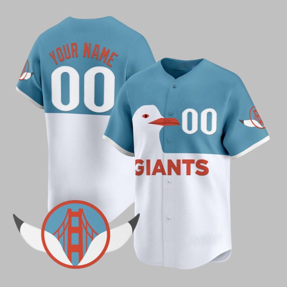 The striking two-tone design features a pacific-blue upper panel, reminiscent of the Bay, seamlessly transitioning into a crisp, fog-white lower half. The front is boldly adorned with a stylized seagull emblem, its determined gaze perfectly capturing the tenacity of the Giants. Below it, the classic “GIANTS” wordmark is rendered in a vibrant, contrasting red, ensuring your team pride is visible from every angle. This jersey is crafted for the modern fan who appreciates tradition but isn’t afraid to embrace a fresh, contemporary look that tells a uniquely San Franciscan story.