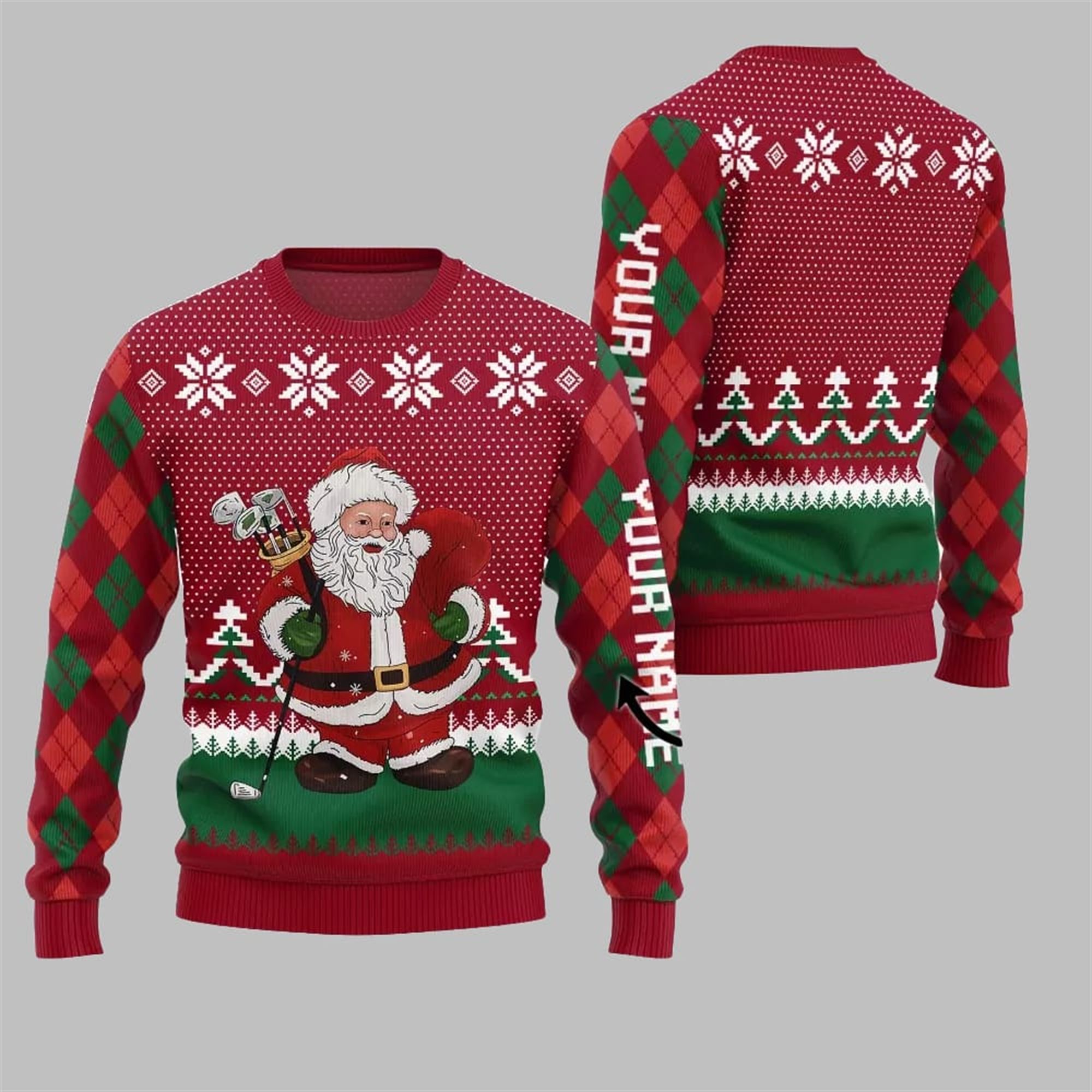 Get ready to swing into the holiday spirit with our Santa Playing Golf Ugly Sweater 2025 Christmas! This vibrant and hilarious sweater captures the joyful moment when St. Nick trades his sleigh for a golf cart. The design features a cheerful Santa Claus, decked out in his classic red suit, pausing on a lush green fairway. With his bag of gifts slung over one shoulder and a trusty golf iron in hand, he’s ready to hit a birdie straight into your Christmas celebration.