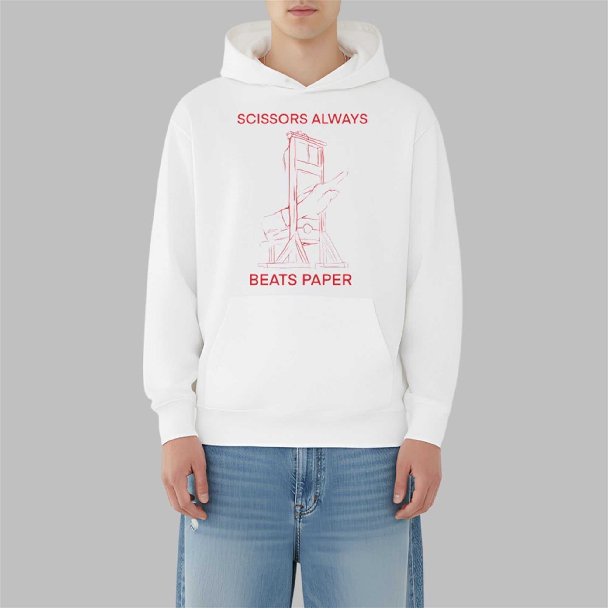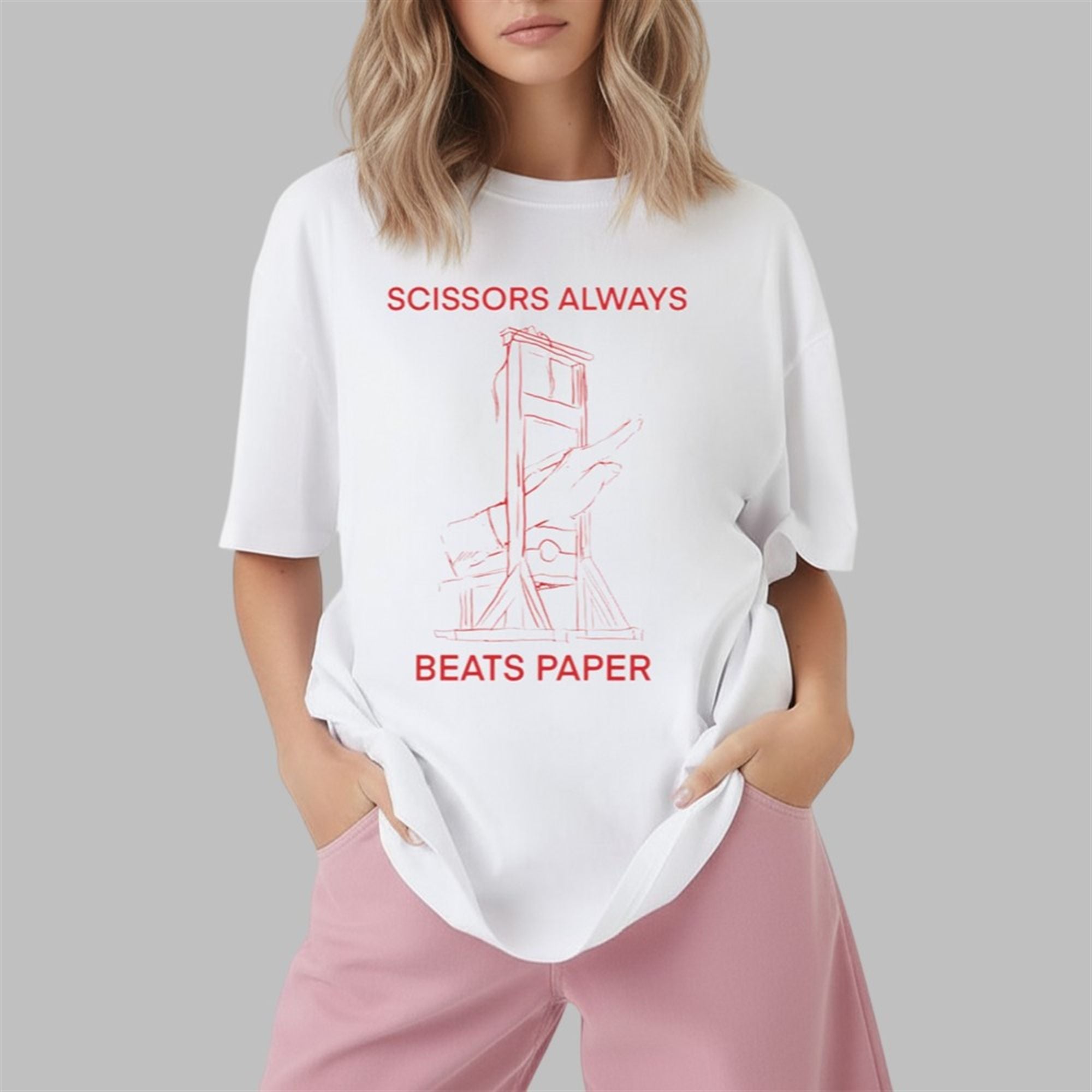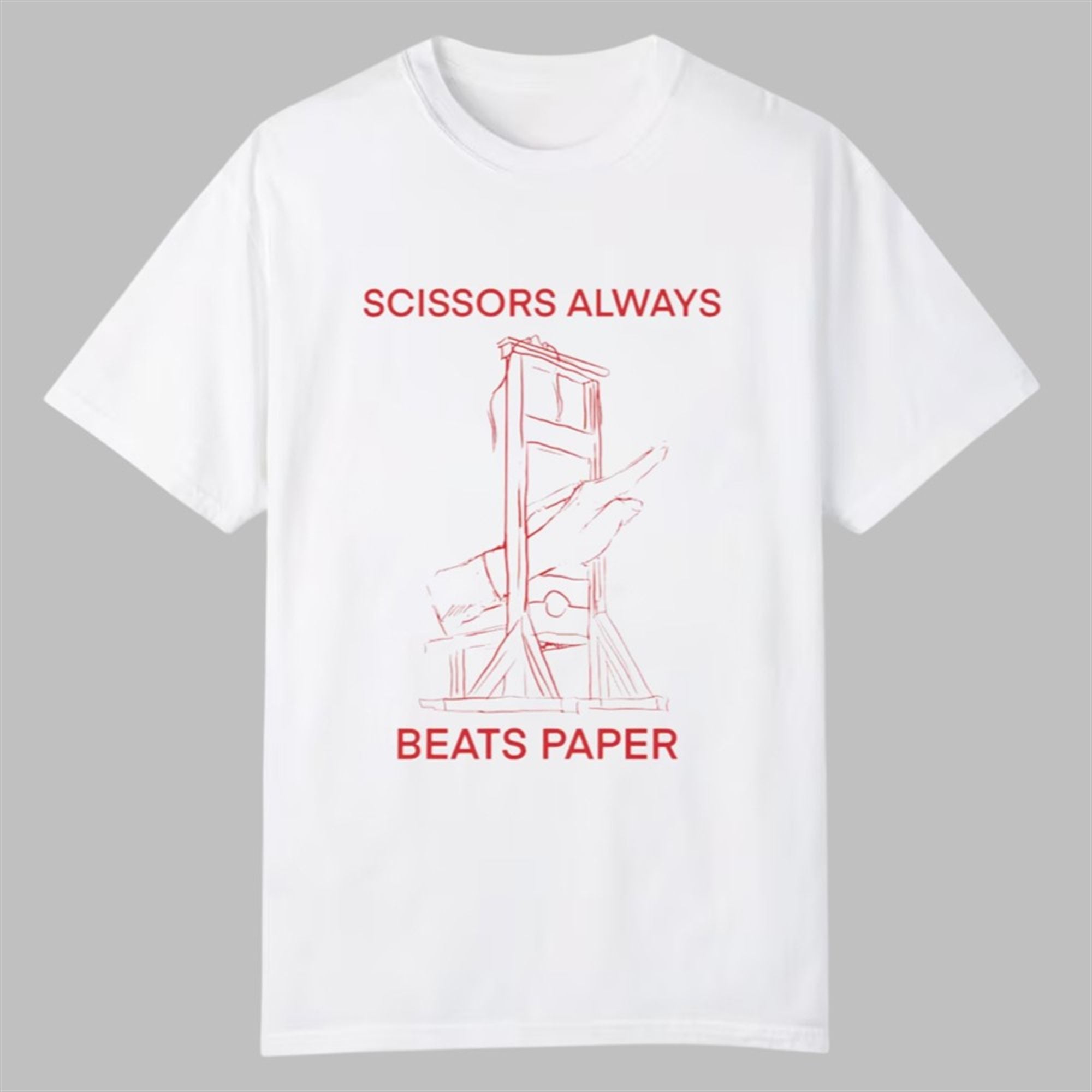 The design features a minimalist, sketch-style illustration of a guillotine rendered in a bold, blood-orange red. Flanked by the text “SCISSORS ALWAYS BEATS PAPER,” the graphic implies a cynical yet humorous take on power dynamics—suggesting that the “scissors” (the machine of the revolution) will always trump the “paper” (laws, lists, or decrees).