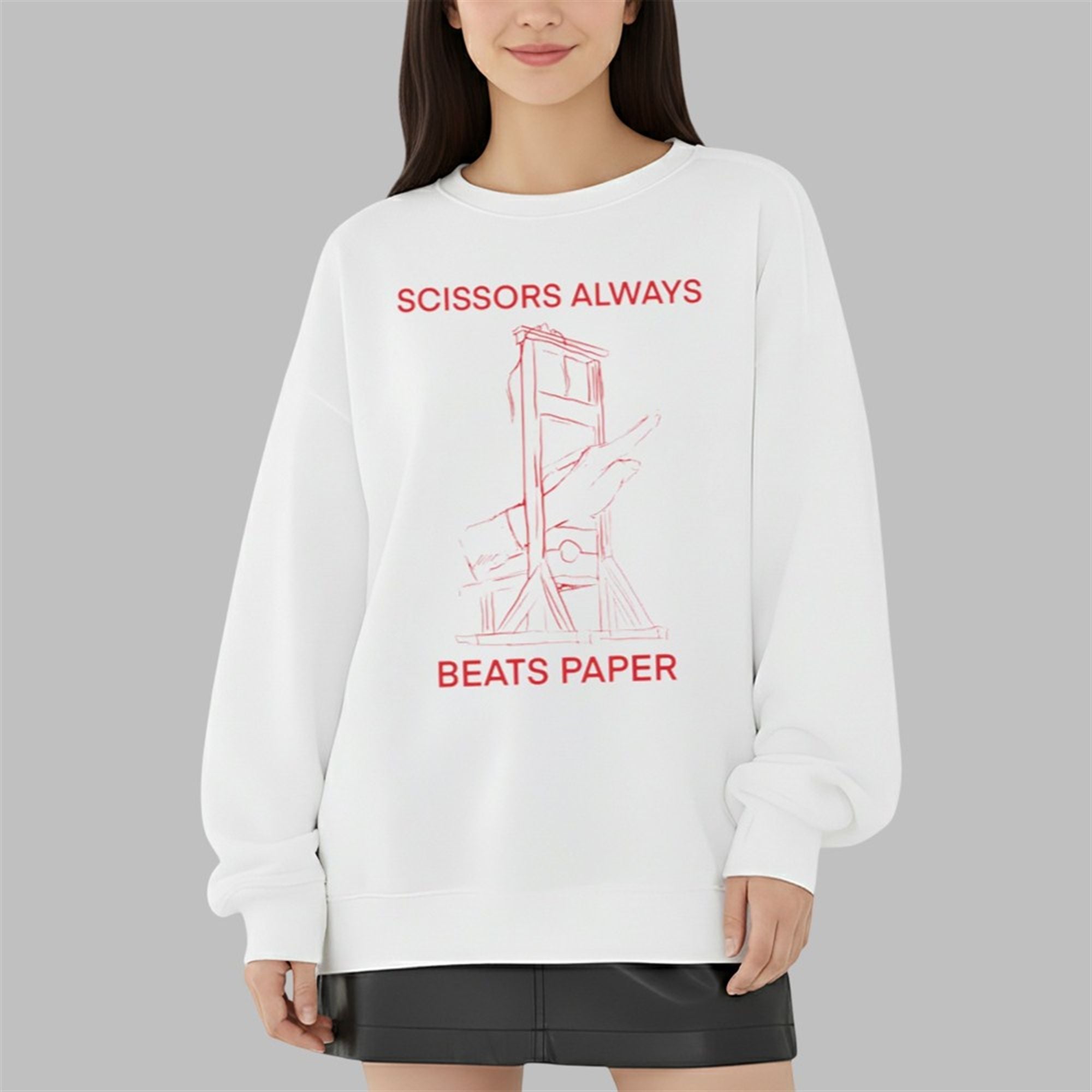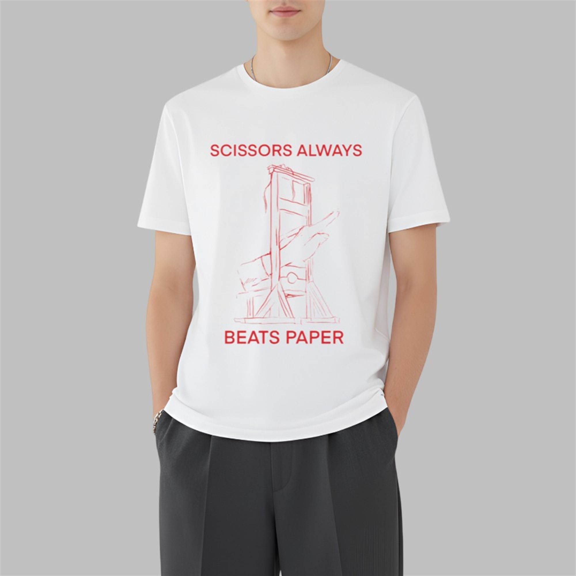 Elevate your casual wardrobe with a slice of historical wit using our Scissors Always Beats Paper Tee. This design takes the innocent childhood game of Rock, Paper, Scissors and gives it a sharp, French Revolution-inspired twist.