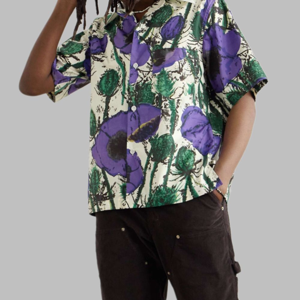 This shirt features a striking all-over floral print, echoing the design elements seen in Scott Evans’ iconic look. Dominated by bold purple poppy-like flowers set against lush green foliage on a light, neutral background, the pattern is both intricate and eye-catching. Crafted with attention to detail, it boasts a classic camp collar design, offering a relaxed, open neckline perfect for warmer climates.