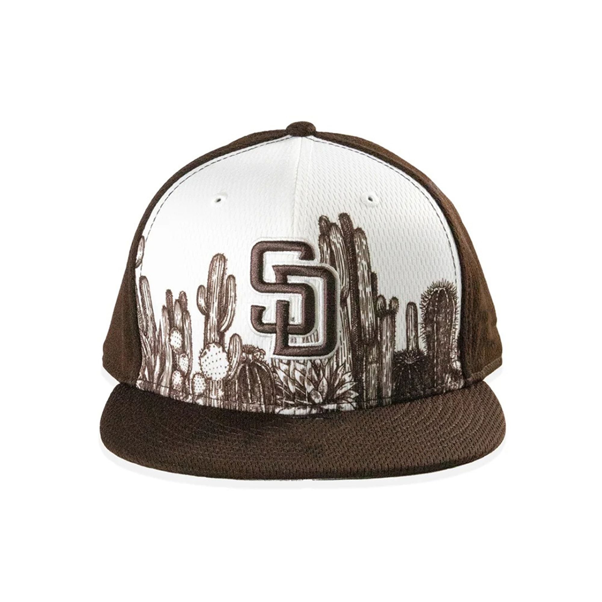 The hat is designed for the modern baseball enthusiast who appreciates the intersection of sport and art. This year, the design team moved beyond simple logo placement to create a full-panel narrative. The front of the cap features a meticulous, sketch-style of Saguaro and Prickly Pear cacti, grounding the classic San Diego Padres “SD” logo in its seasonal home: the Arizona desert. The contrasting white front panels provide a crisp backdrop for the earth-toned artwork, while the brown mesh and brim maintain the team’s signature identity.