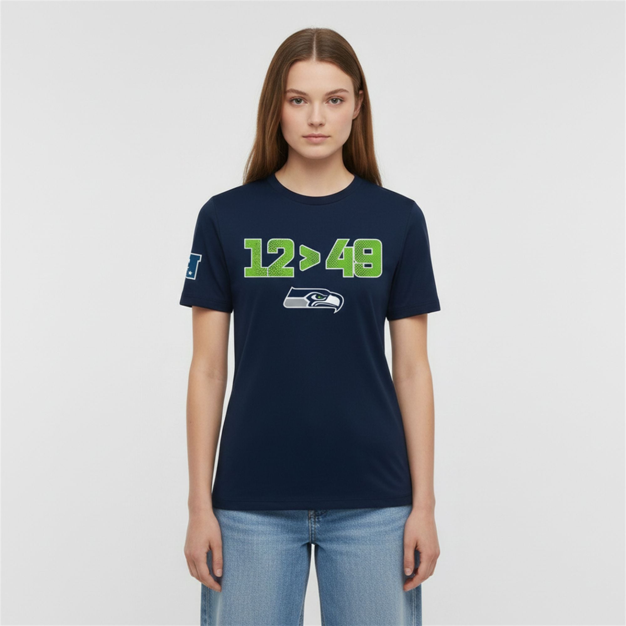 The “12 > 49” design exploded across social media because it transforms a complex football season into a simple, meme-able math equation that insults a rival without using a single word of profanity. By mathematically stating that the “12” (fans) are objectively greater than the “49” (San Francisco), it creates an “inside joke” that only football fans understand, rewarding the wearer with instant credibility.