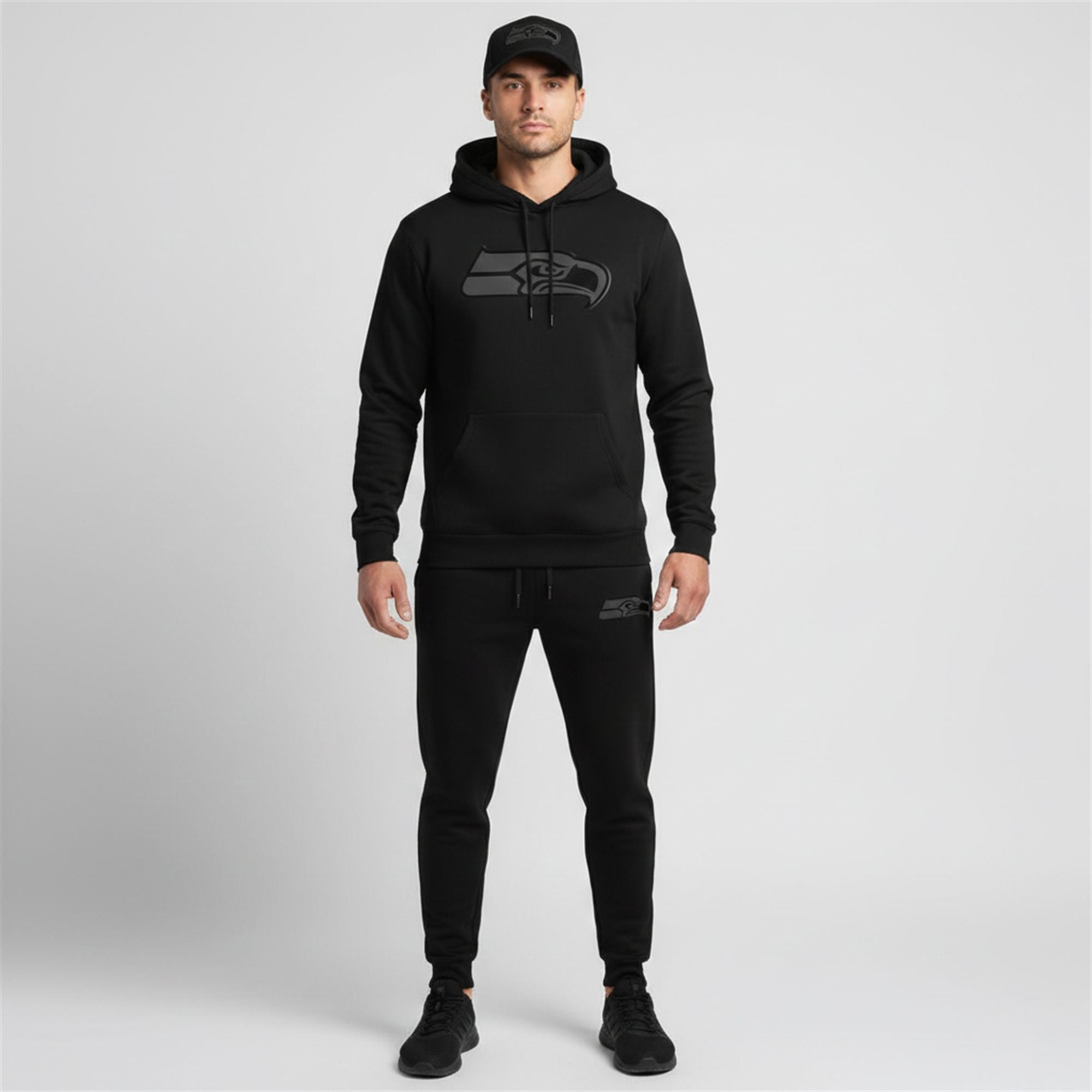 Unlike traditional team gear that relies on loud neon greens and deep blues, this collection strips the aesthetic back to its raw power. The centerpiece is the “Ghost Hawk” logo—a greyscale, high-density print that sits ominously against the black fabric. The back of the hoodie proudly displays “SEATTLE SEAHAWKS FOOTBALL” in bold, slate-grey typography, ensuring your allegiance is visible from every angle. This is more than a tracksuit; it’s a uniform for the dedicated.
