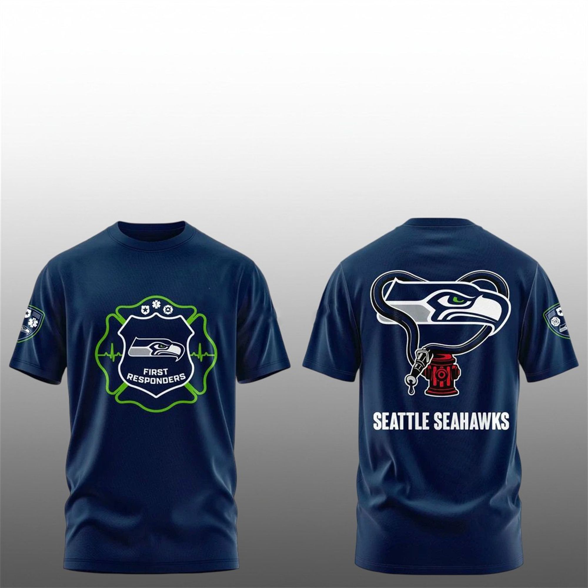 On the back, the tribute continues with a large-scale graphic that is both artistic and meaningful. It depicts the Seahawks’ hawk head logo embraced by a stethoscope forming a heart shape, which connects to a red fire hydrant symbol. This creative artwork symbolizes the heartbeat of the community and the unwavering protection provided by first responders. It is a comprehensive design that speaks to the multi-faceted nature of emergency services, all while maintaining a sleek, sporty aesthetic suitable for Lumen Field or a casual day out.