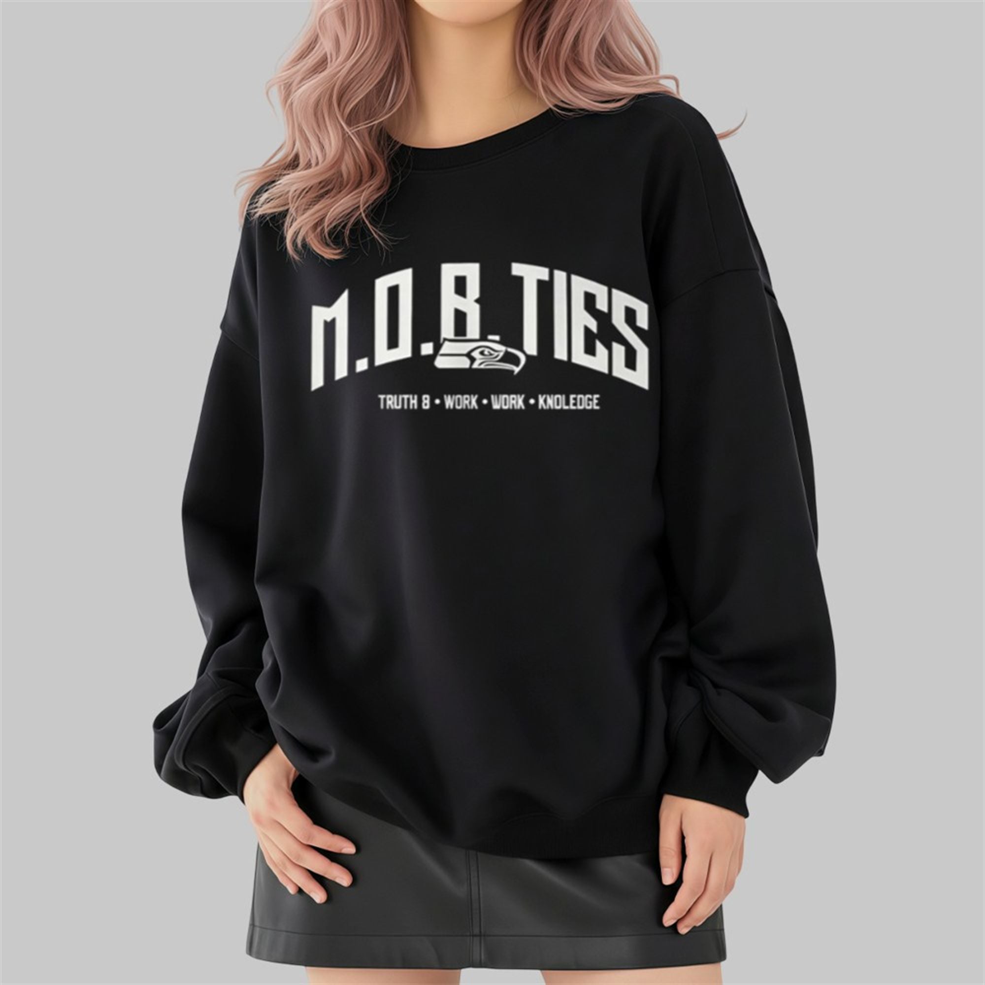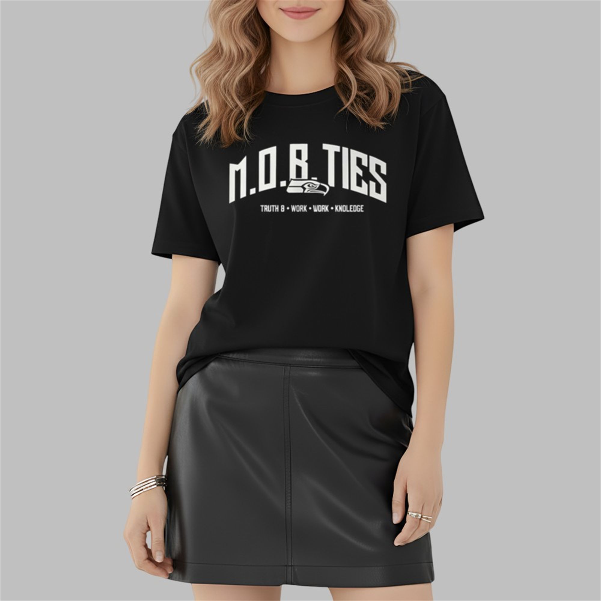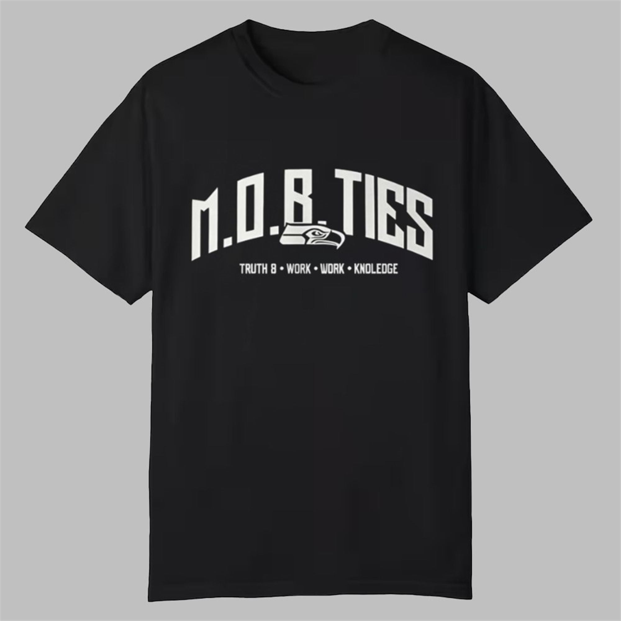 The M.O.B. TIES Shirt is a high-impact, conversation-starting piece of apparel catapulted into the spotlight by Seattle Seahawks defensive tackle, Leonard Williams. Captured at a post-game or practice presser, Williams’ choice of this shirt—over typical team-issued gear—signals a personal endorsement of its message and style. The shirt features a bold, arched graphic reading “M.O.B. TIES” in white, complemented by the inspirational motto: “TRUTH • WORK • WORK • KNOLEDGE” (with the unique spelling of ‘Knowledge’). Crucially, the design incorporates a stylized Seahawks logo centered beneath the main text, making it an unmistakable tribute to the Seattle football franchise.
