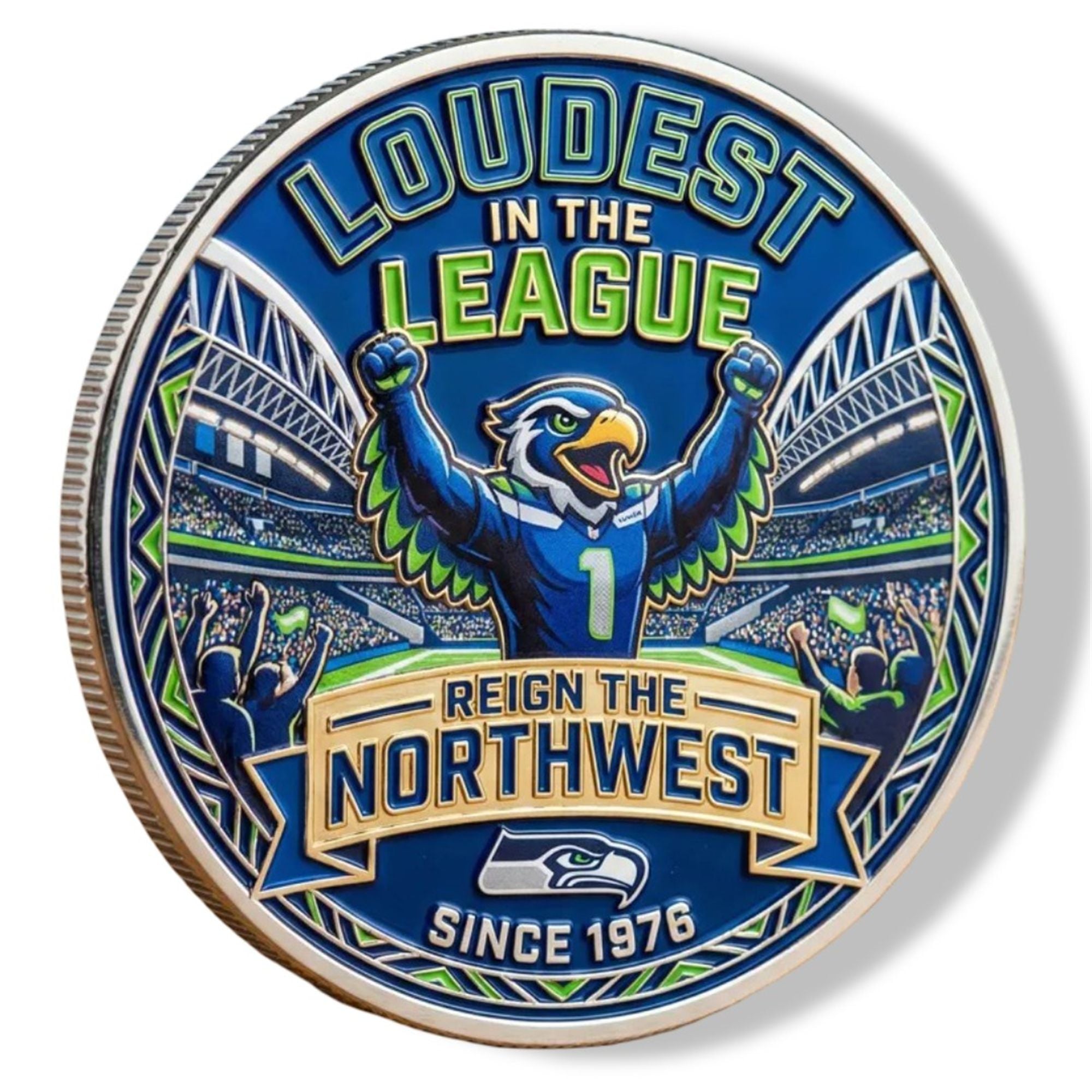 The reverse side of the coin pays homage to the legendary “12s“—the fans who hold the record for the loudest crowd roar at a sporting event. The design features a high-energy illustration of Blitz with arms raised, inciting the crowd, set against a backdrop of the stadium’s signature roofline. The text “LOUDEST IN THE LEAGUE” and “REIGN THE NORTHWEST” encircles the image, cementing the identity of the Seattle fanbase.