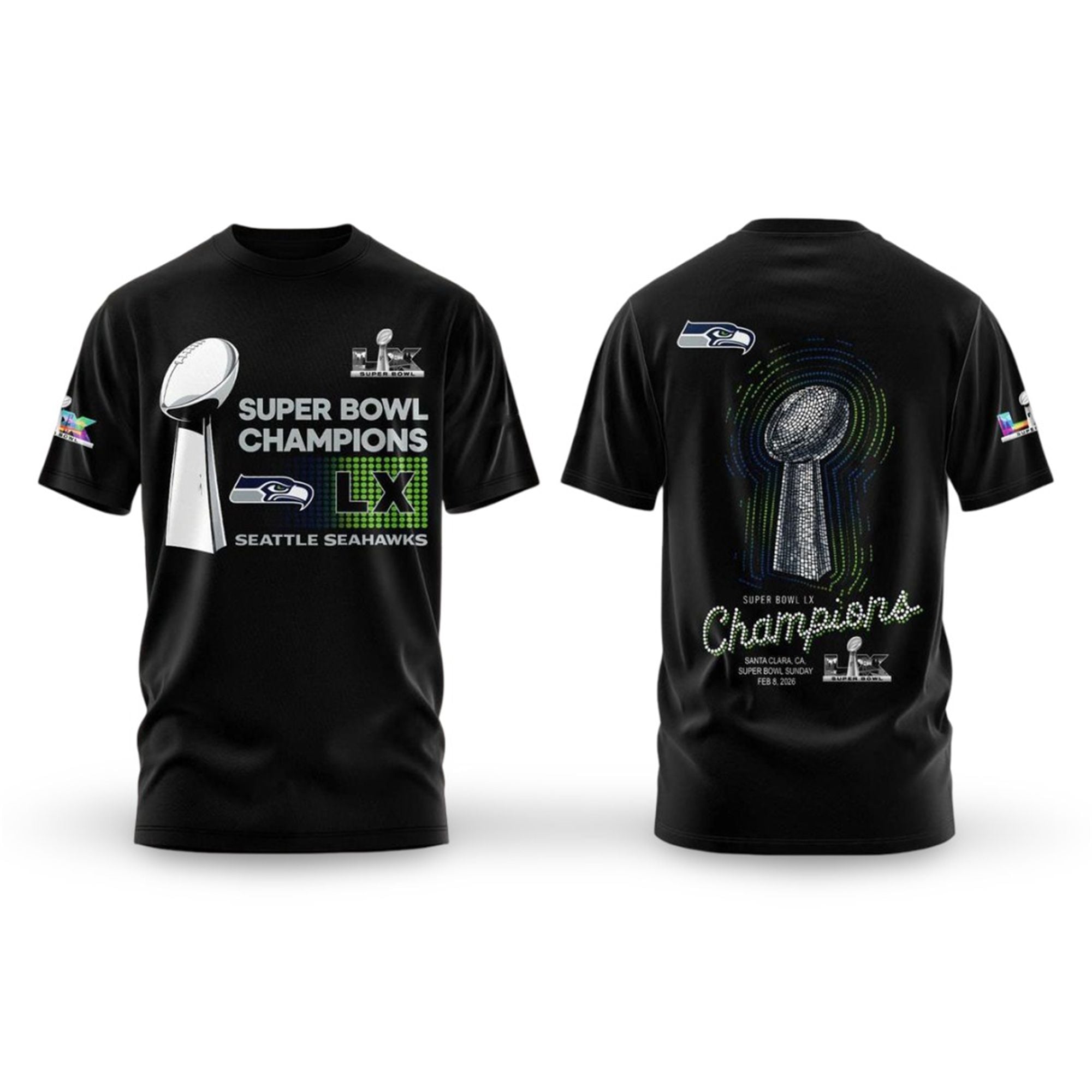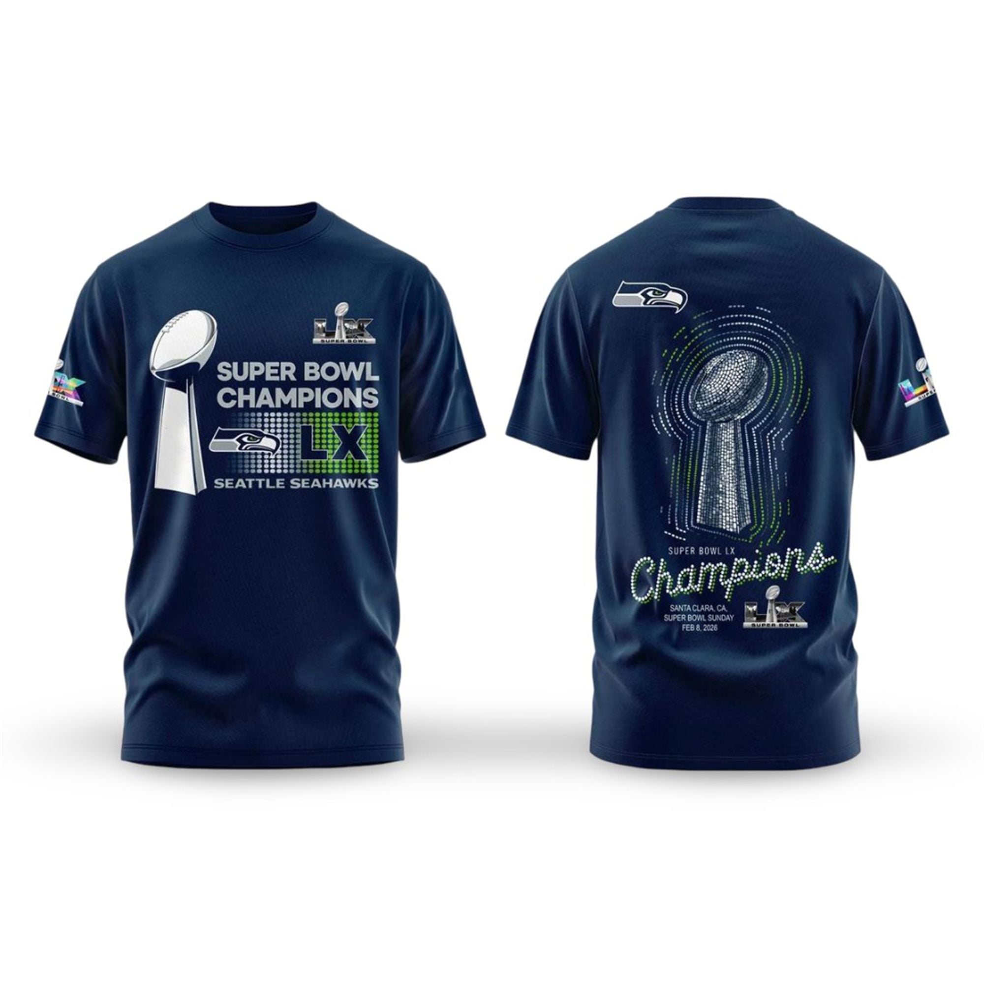 The front graphic boldly displays the coveted Vince Lombardi Trophy alongside the “Super Bowl Champions” text, anchored by the massive “LX” graphic. The use of the Seahawks‘ signature Action Green against the deep Navy background creates a high-contrast visual that pops in photos and stands out in crowds.