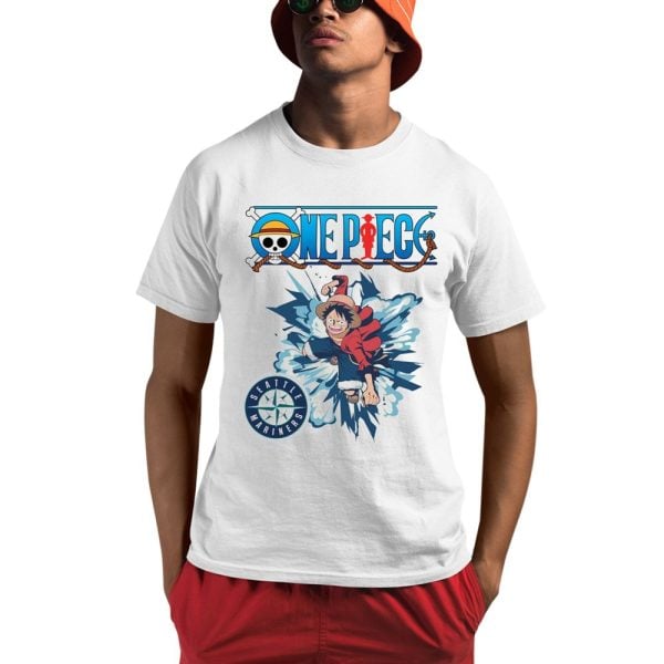 Embark on a style adventure with this Seattle Mariners One Piece Shirt. The centerpiece is a vibrant, action-packed graphic featuring Monkey D. Luffy, the rubbery captain of the Straw Hat Pirates, ready for action. The design incorporates the instantly recognizable One Piece logo prominently displayed above Luffy, alongside other thematic elements like the stylized compass rose representing adventure and navigation on the Grand Line.