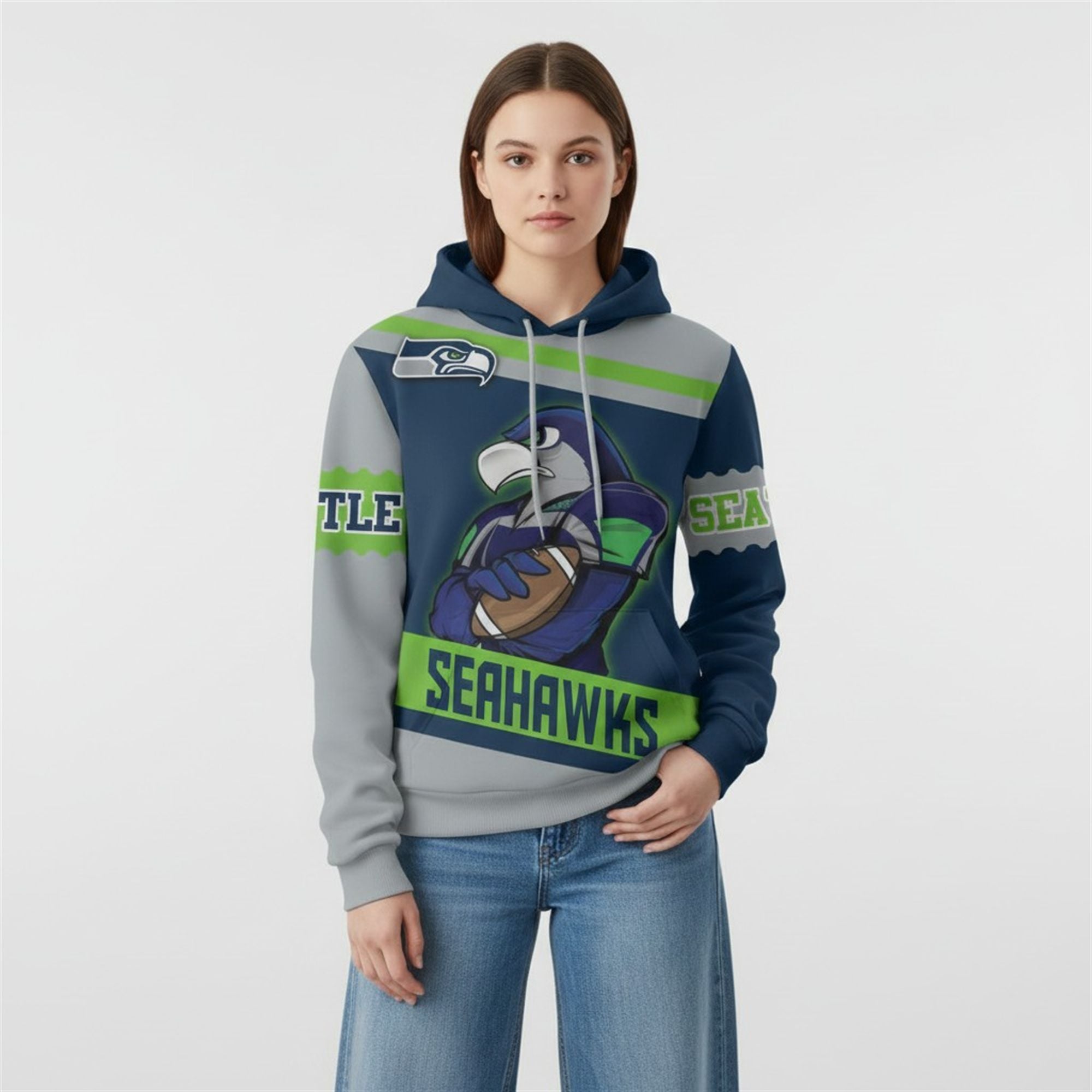 This product is specifically curated for the fan who lives and breathes Seahawks football. It transcends standard merchandise by tapping into the core identity of the franchise: the noise, the energy, and the intimidation factor of playing in Seattle. The front of the hoodie continues the theme with a sleek Seahawks logo on the chest and “SEAHAWKS” text along the bottom hem, ensuring your allegiance is visible from every angle. It provides a comfortable fit perfect for layering during those crisp Pacific Northwest game days or casual wear throughout the week.
