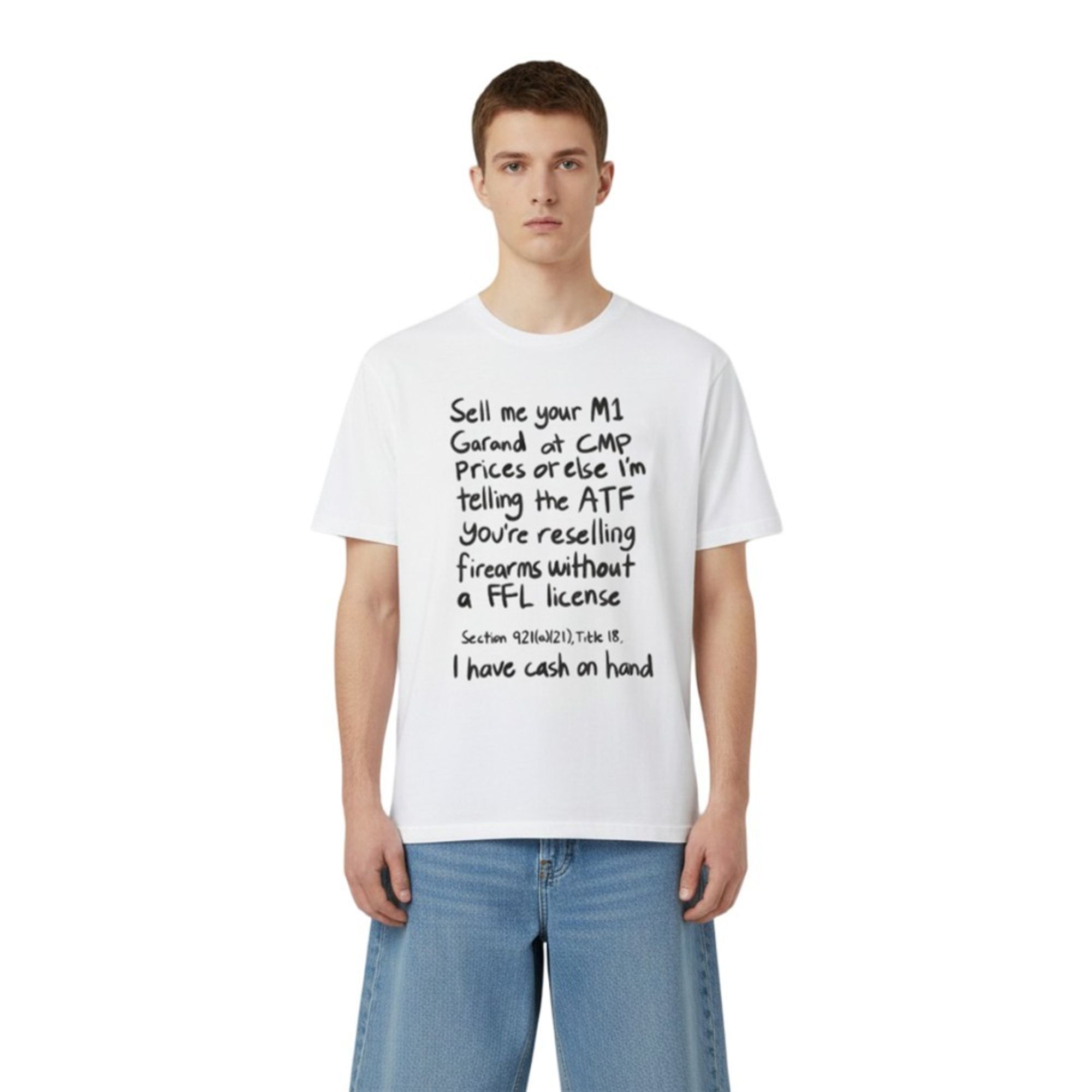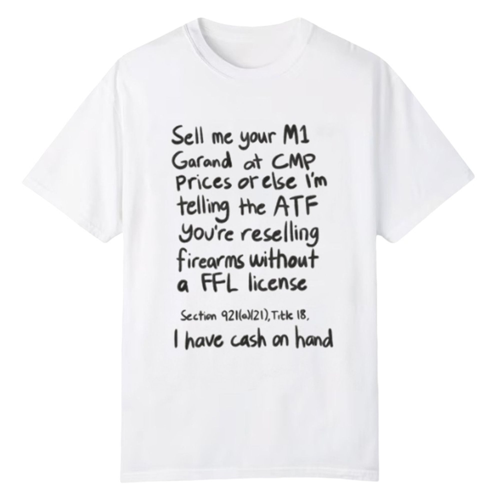 The text on the shirt—”Sell me your M1 Garand at CMP Prices or else I’m telling the ATF You’re reselling firearms without a FFL license“—plays on the complex legal landscape of gun collecting (specifically Section 921(a)(21) of Title 18) while poking fun at those looking to flip surplus rifles for quick profit. It’s satire, it’s strategy, and it’s a badge of honor for anyone who knows the true value of a rack-grade vs. a service-grade rifle.