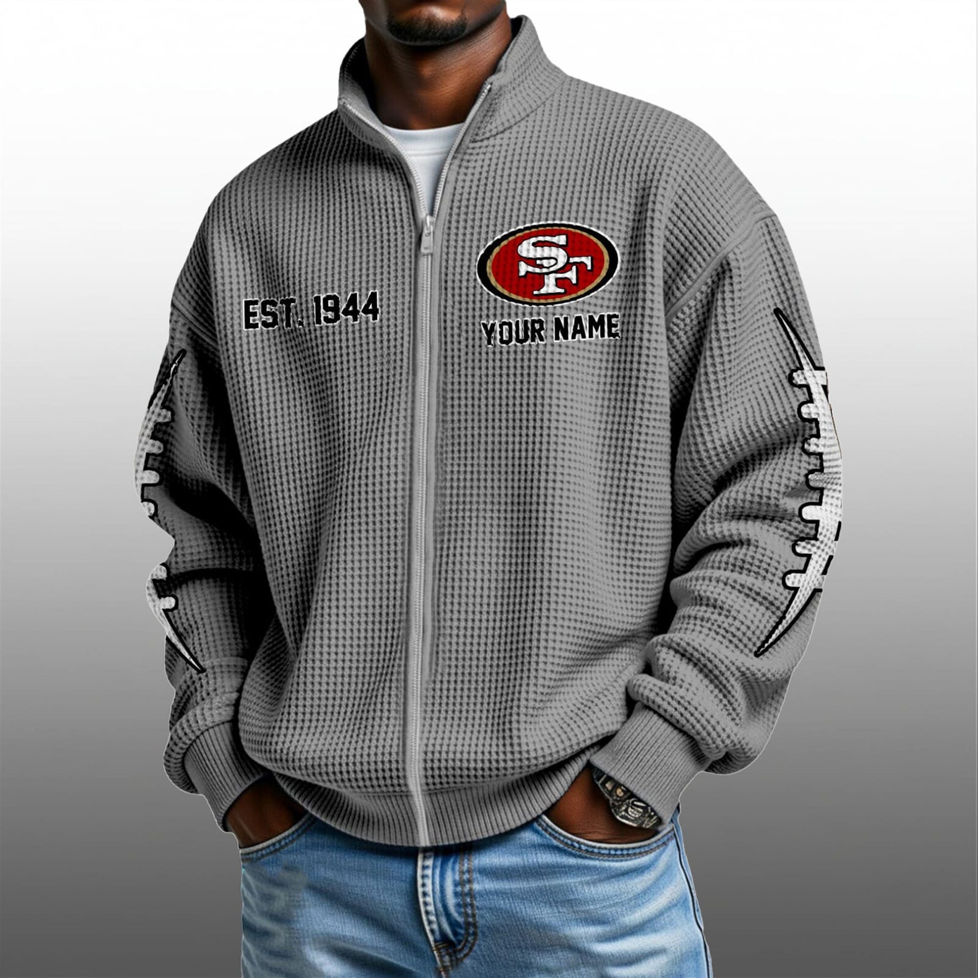 The design breaks the mold by utilizing a soft, pastel lavender colorway—a trending palette in 2025 sports fashion—accented by the iconic 49ers oval logo and aggressive, stylized football stitching running down the sleeves. The “EST 1944” print pays homage to a vintage era of gridiron history, giving the piece a retro-varsity feel. Completed with a sleek silver zipper and a “Your Name” customization slot, this quarter-zip bridges the gap between customized jersey culture and high-street fashion.