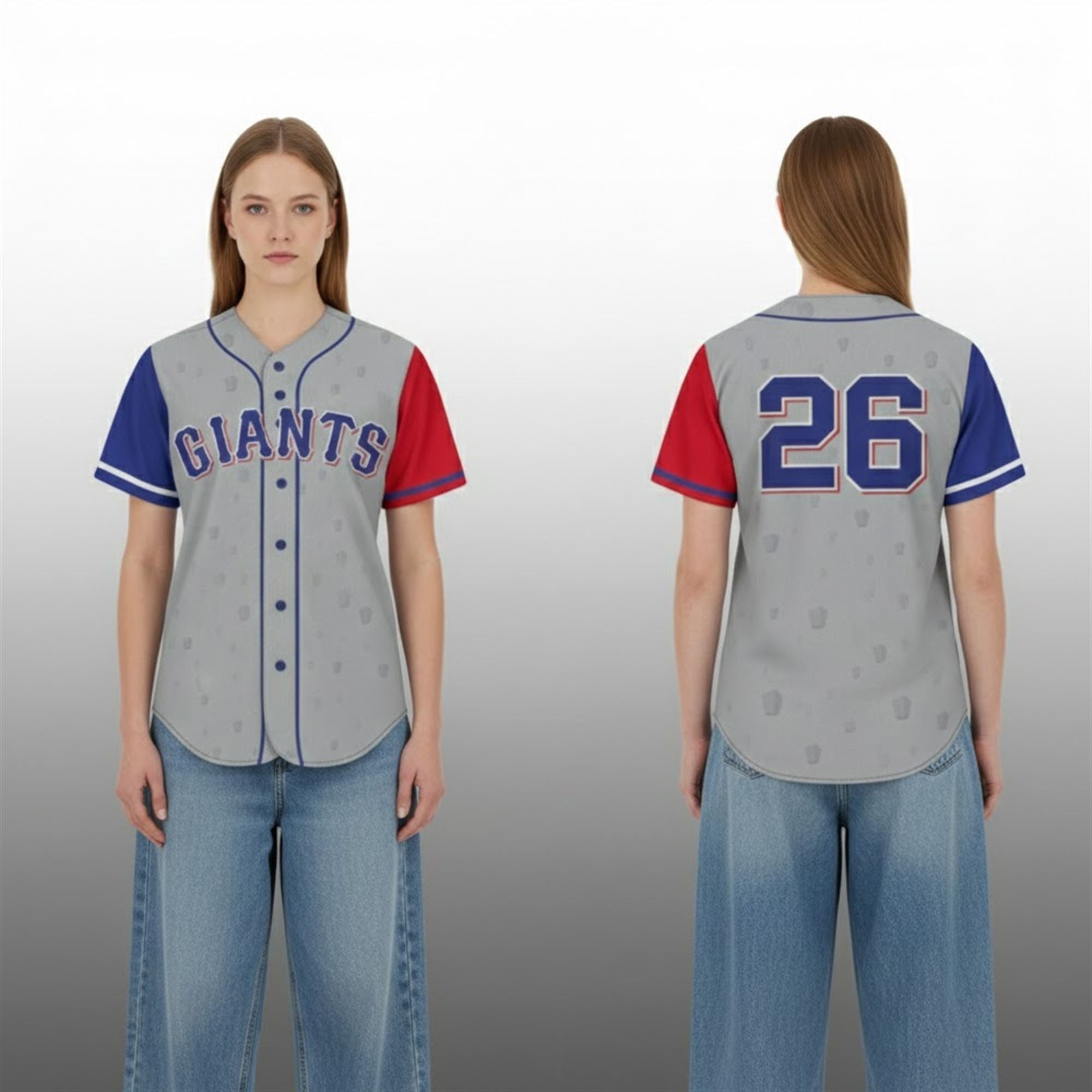 The body of the jersey features a cool grey tone, serving as a neutral canvas that allows the vibrant details to pop. The most striking feature is the asymmetrical sleeve coloring—a deep royal blue on the right sleeve and a vibrant crimson red on the left. This “mismatched” style is a direct nod to the colors of the Taiwanese flag, creating an instant visual connection to the heritage it celebrates. The front emblazons “GIANTS” in the classic serif font, outlined in red and blue to maintain team identity while integrating the night’s theme.