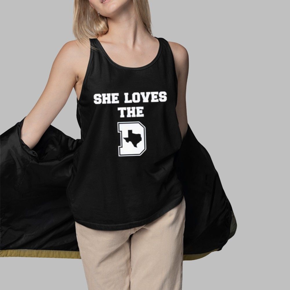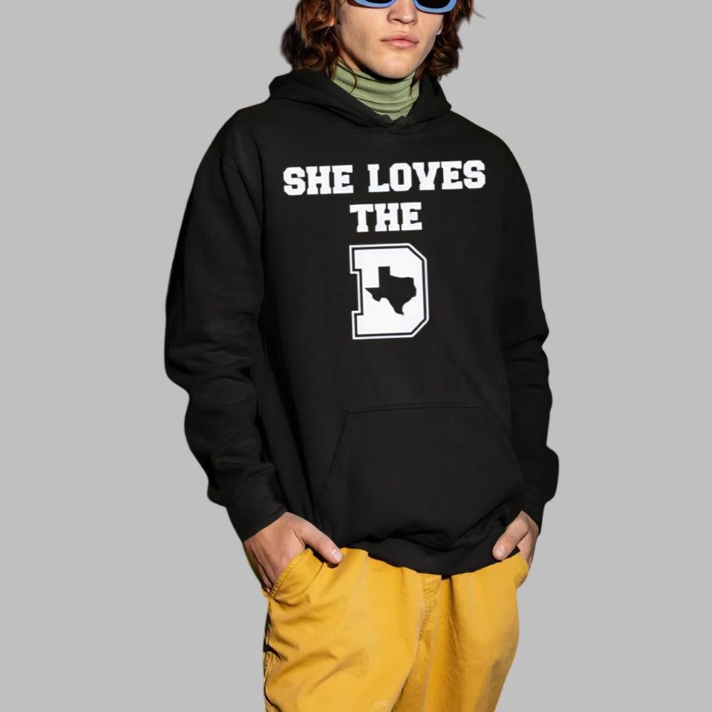 This She Loves The D Texas Map Shirt is crafted for the true Texan—or the Texan at heart. The design operates on multiple levels of cleverness, making it the perfect apparel for any occasion. For the die-hard sports fan, the “D” is an unmistakable nod to Dallas, the heart of Texas sports culture and home to legendary teams. It can also stand for a dominant “Defense,” a point of pride for any football fanatic. Beyond the sports arena, it’s a playful and cheeky statement for anyone who appreciates a good joke and the confident, larger-than-life attitude that Texas is famous for. This triple-entendre design ensures your shirt is always the center of attention, whether you’re at a tailgate, a backyard barbecue, or just out on the town.