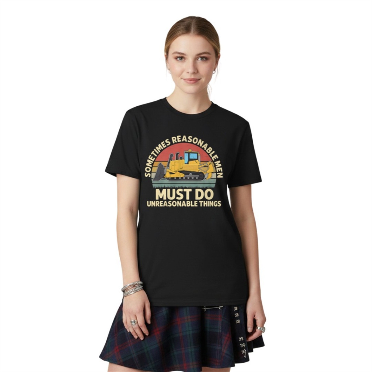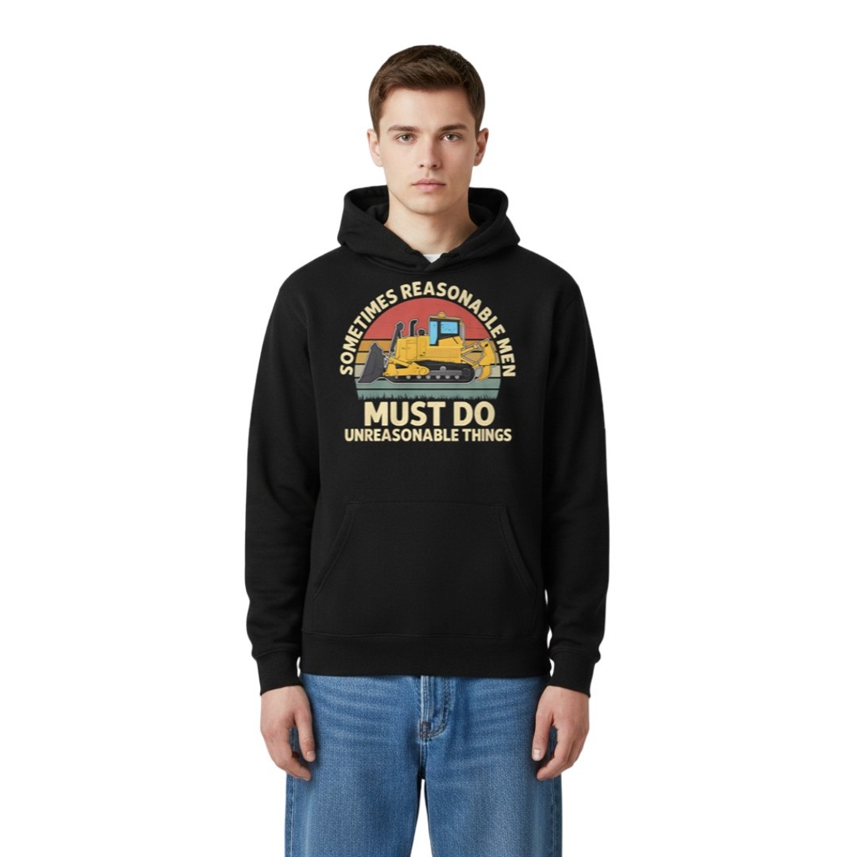 This unique graphic apparel merges retro design sensibilities with a heavy, historically significant message. The front of the shirt features a meticulously illustrated armored bulldozer—widely recognized in internet culture as the “Killdozer“—set against a classic, distressed 1970s-style sunset. Bold, vintage typography frames the illustration with the chilling and legendary quote: “Sometimes Reasonable Men Must Do Unreasonable Things.”