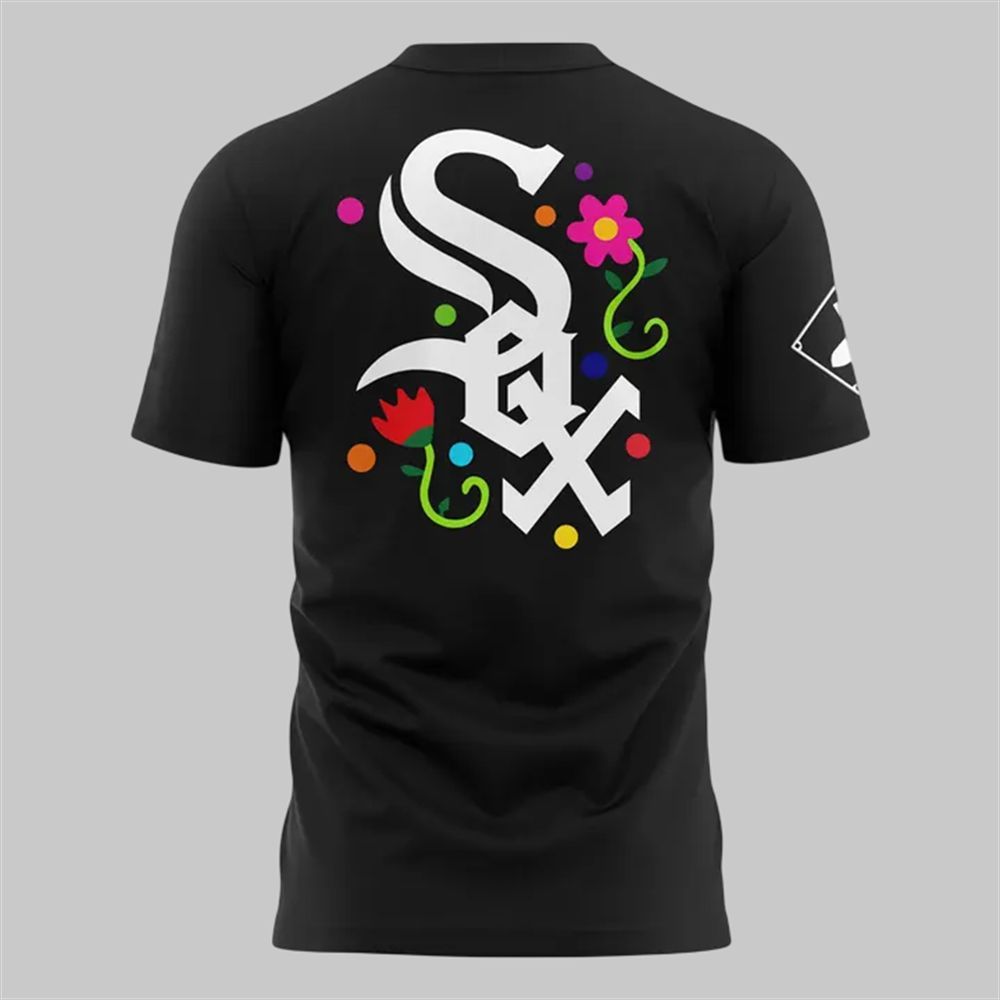 The true showstopper, however, is on the back. The iconic “SOX” logo is reimagined, infused with a brilliant explosion of colorful flowers and patterns inspired by traditional Latin American folk art. This beautiful detailing, reminiscent of designs seen in Día de los Muertos celebrations, transforms the logo into a stunning cultural emblem. Printed on a classic black tee, the vibrant colors of the design pop, ensuring you’ll turn heads whether you’re at the ballpark or out on the town.
