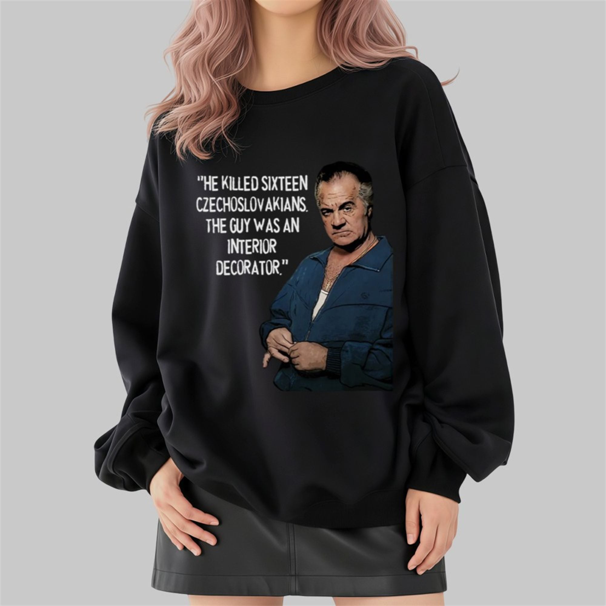 This graphic tee features a striking, stylized portrait of Paulie Gualtieri, complete with his trademark silver “wings” hairstyle, gold chain, and blue tracksuit. Next to him sits the immortal quote “he killed sixteen czechoslov akians, the guy was an interior decorator“,that highlights exactly why fans love him: he is tough, he is loyal, but he isn’t always the best listener.