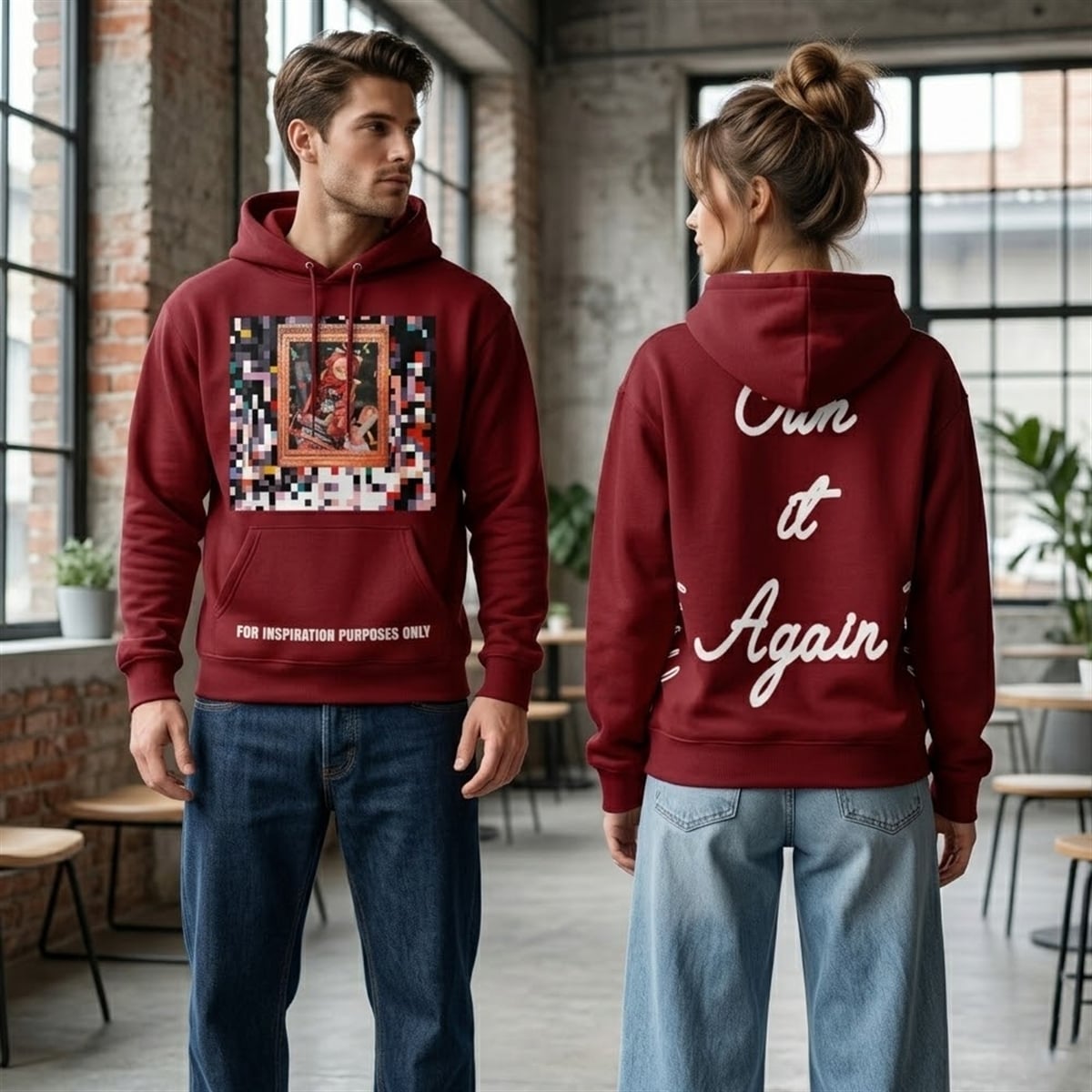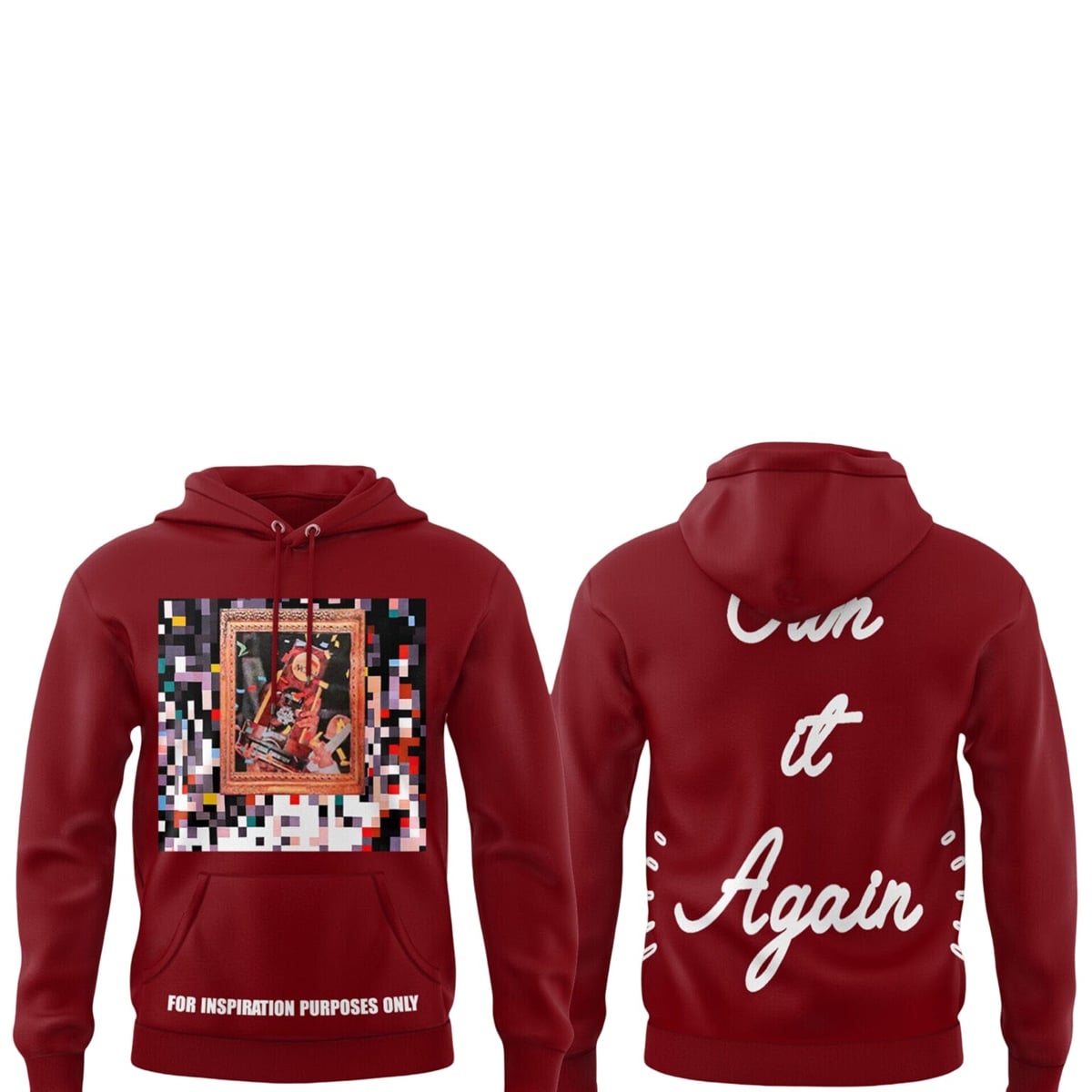 The hoodie is far more than standard team merchandise; it is a canvas of cultural significance and athletic dominance. Presented in the university’s iconic dark garnet red, the garment commands attention through its innovative front graphic. Featuring a retro-digital, heavily pixelated glitch effect that frames a stylized trading-card portrait, it seamlessly merges classic sports nostalgia with avant-garde digital art. At the bottom of this striking visual matrix sits the bold, capitalized phrase, “FOR INSPIRATION PURPOSES ONLY.”