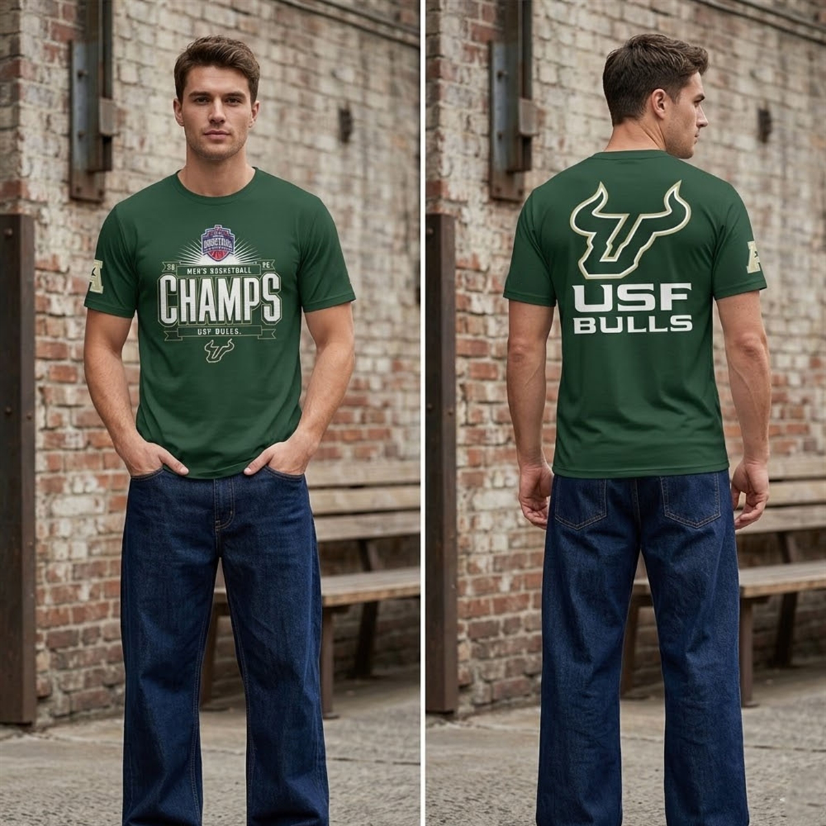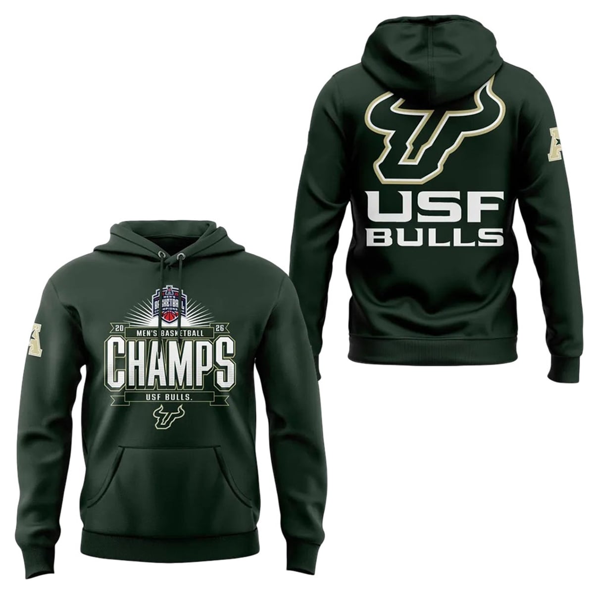 The shirt is a bold statement piece meticulously designed for true supporters of the university’s athletics program. Sporting the iconic USF deep green and striking gold color palette, the front of the garment prominently features massive, block-style “CHAMPS” typography positioned right below the American Athletic Conference tournament emblem. The reverse side proudly displays the legendary, oversized USF Bull head logo alongside the university’s bold lettering, ensuring your team allegiance is highly visible from absolutely every angle. It serves as a wearable trophy, allowing devoted fans to carry the momentum and excitement of the 2026 championship season wherever they travel.
