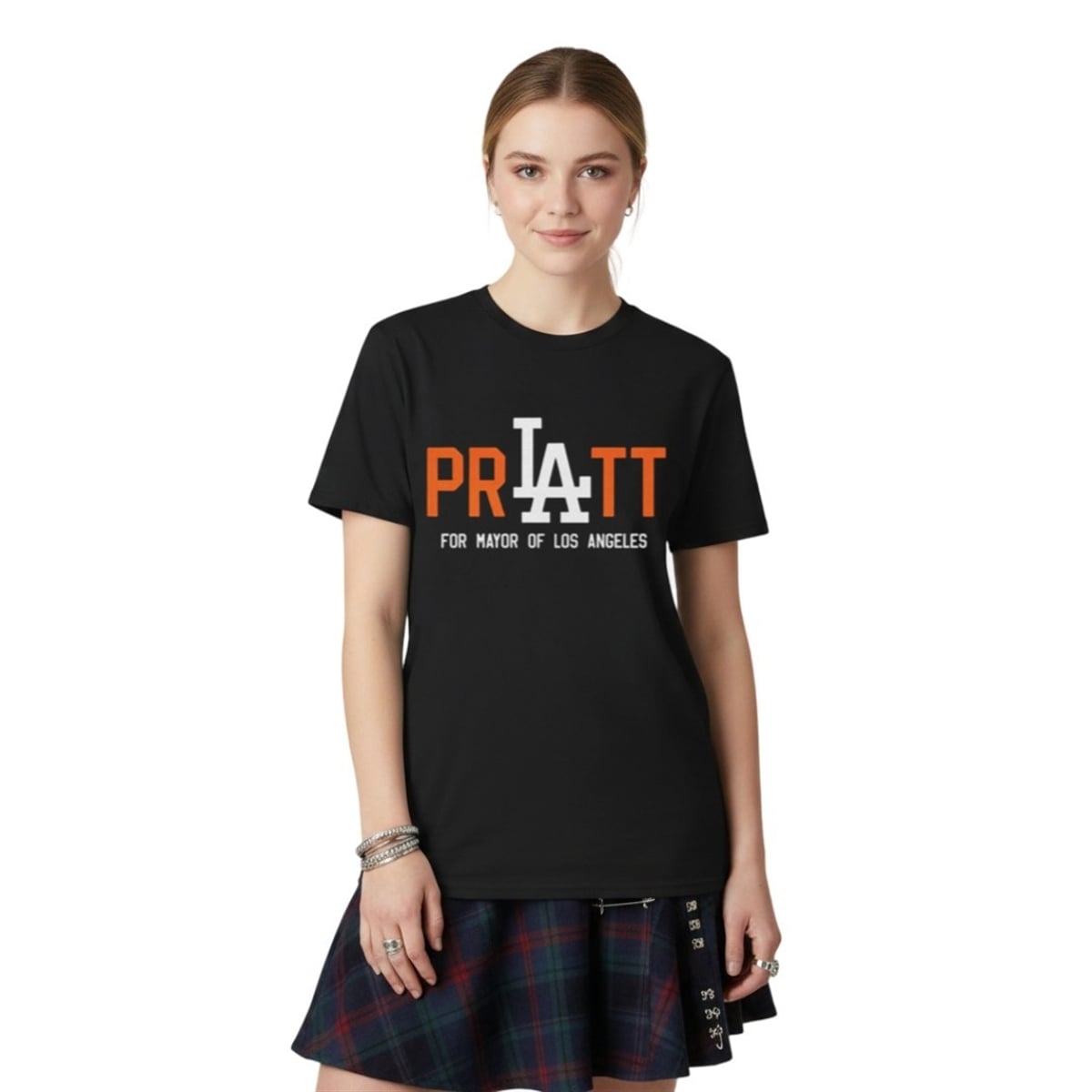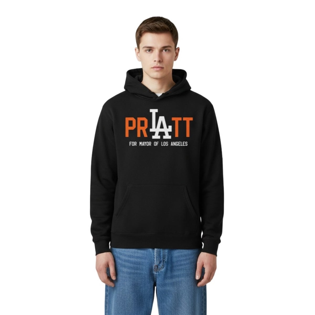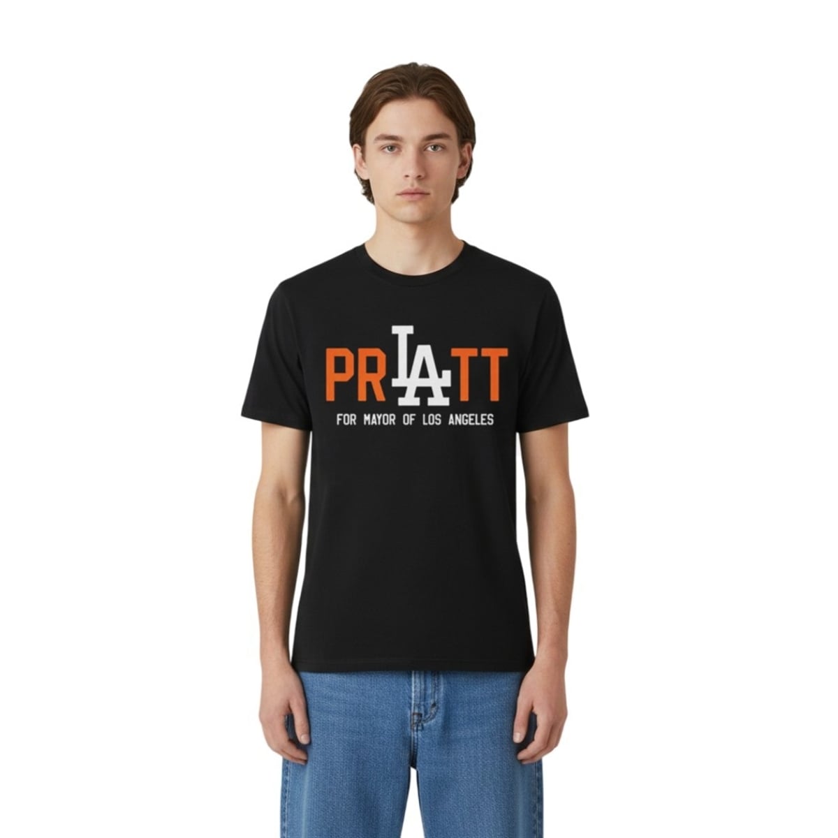 Furthermore, the design achieves absolute brilliance by swapping the “A” in “PRATT” with an interlocking typographic homage to the iconic Los Angeles baseball insignia. This specific visual choice anchors the garment deeply into LA culture. It is not just about the celebrity; it is about the city itself. By blending sports typography, political campaign aesthetics, and reality TV infamy, the design creates a multilayered visual joke that resonates instantly with anyone familiar with the West Coast lifestyle.