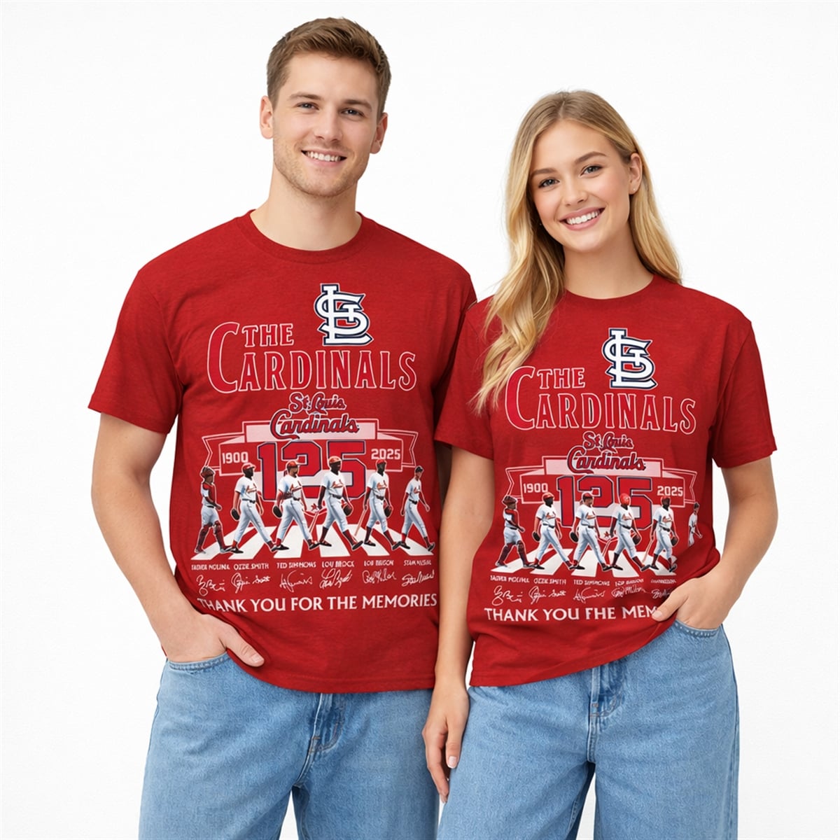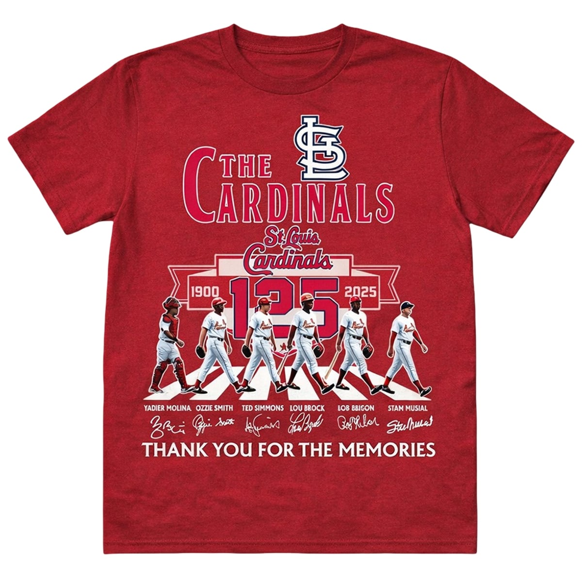 The core meaning of this design revolves around the concept of a “living legacy.” The crosswalk imagery is highly symbolic; it represents the passage of time and the journey of the franchise from its early origins in 1900 into the modern era of 2025. By showcasing different players walking in unison, it highlights the shared brotherhood of the team across decades. The facsimile signatures add a personal touch, symbolizing the indelible mark these individuals left on the city and the sport. The “Thank You For The Memories” text is the voice of the fans—a collective expression of appreciation for the home runs, the spectacular catches, and the championship parades that have defined the St. Louis experience.