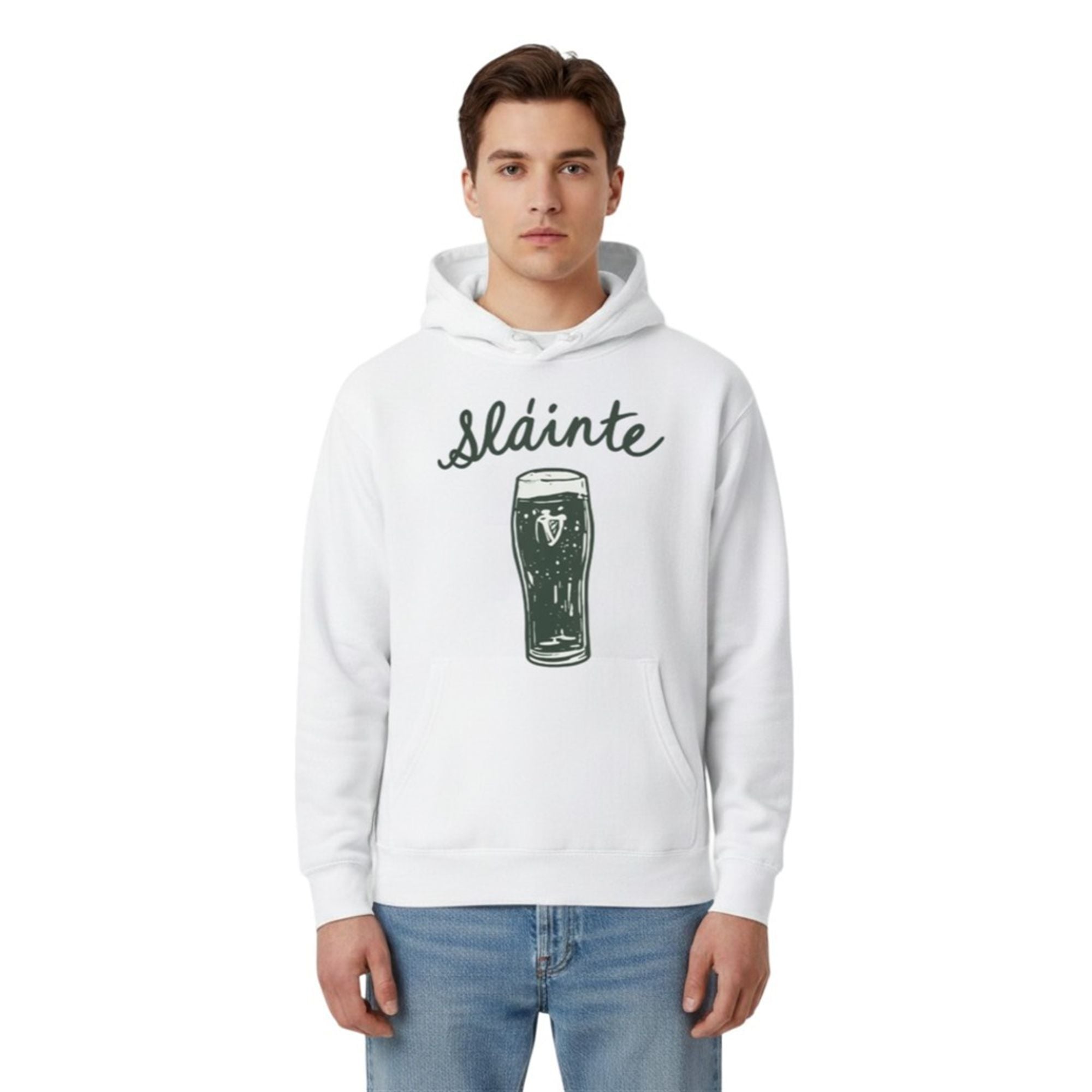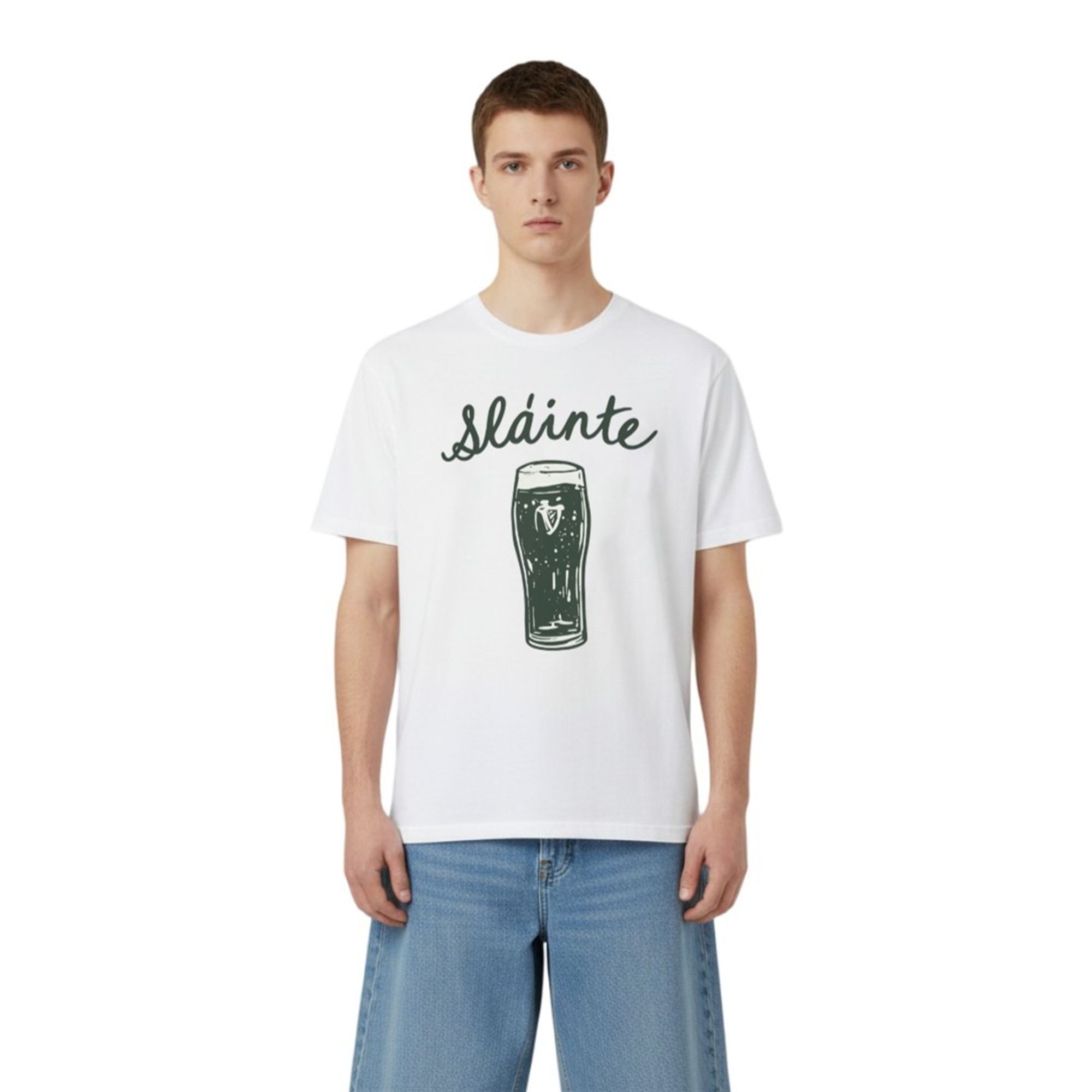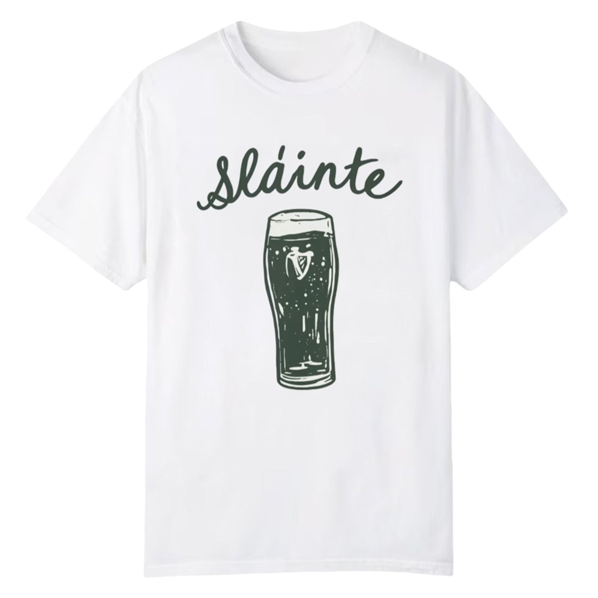 When March rolls around, standing out in a sea of generic holiday apparel requires a design that speaks to the true traditions of the Emerald Isle. This beautifully illustrated graphic tee features the word “Sláinte” written in an elegant, flowing script, arched perfectly over a freshly poured pint of dark Irish stout. Complete with a classic Celtic harp logo resting in the rich, dark body of the beverage and a frothy white head, the imagery instantly transports you to a cozy, fire-lit pub in Dublin.