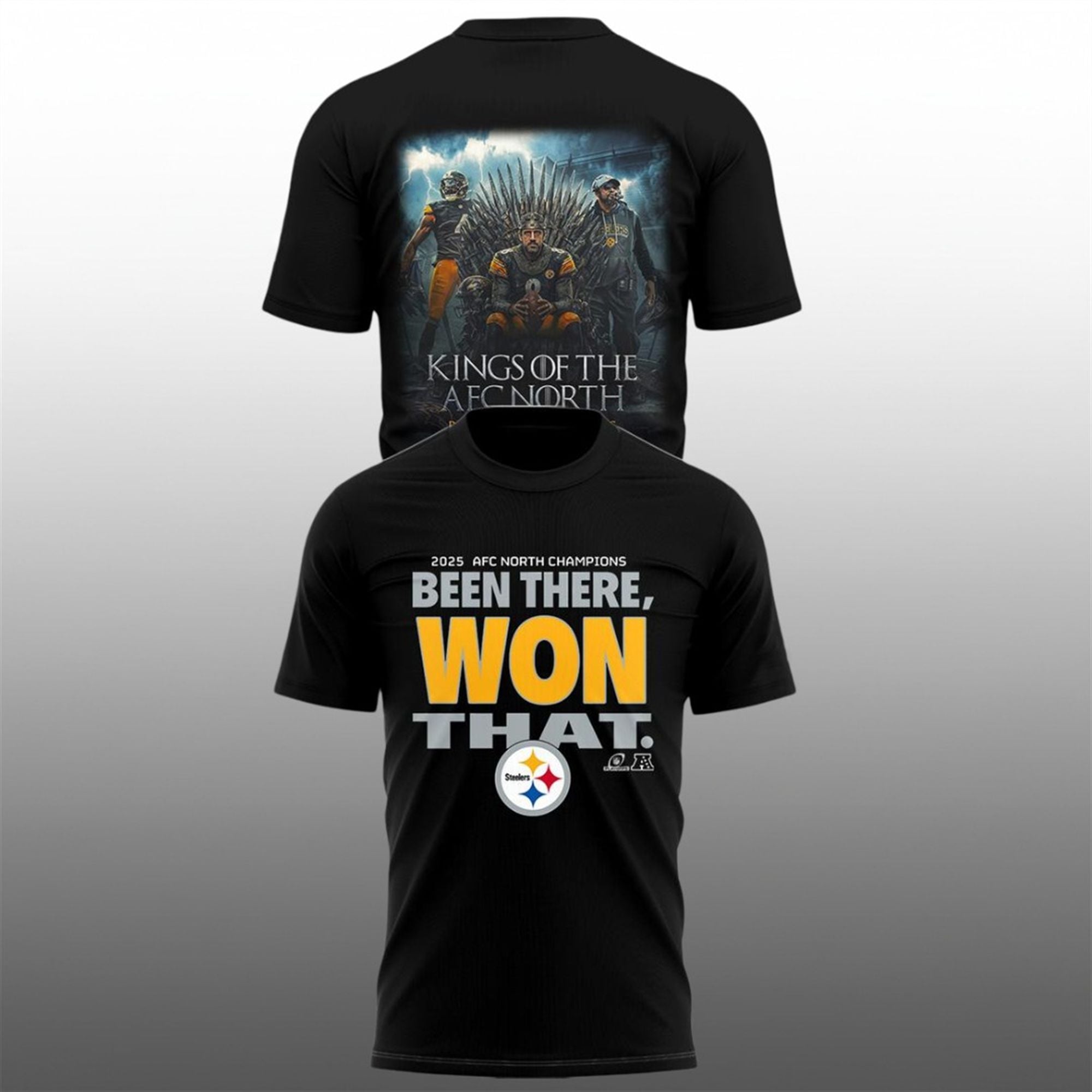 The front design features the bold declaration “2025 AFC NORTH CHAMPIONS: BEEN THERE, WON THAT.” anchored by the iconic Steelers logo. It’s a confident nod to the franchise’s history of excellence—reminding rivals that while they might visit the top, Pittsburgh lives there.