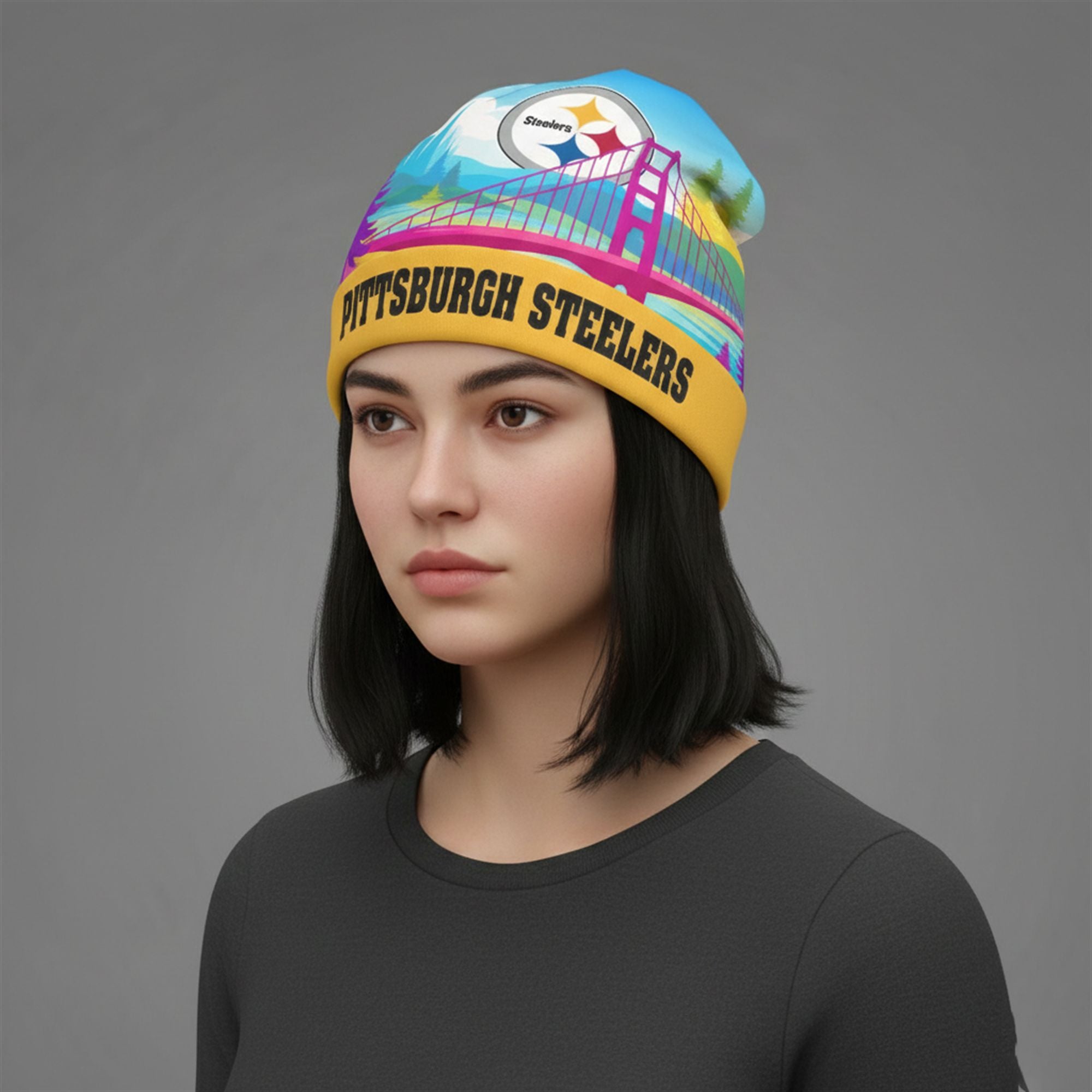 This item serves as a visual time capsule for the 2026 season. It connects the industrial toughness of Pittsburgh—represented by the bold, block-lettering on the signature yellow cuff—with the artistic, colorful flair of California. It is a statement piece for the fan who wants to stand out in the sea of Terrible Towels.