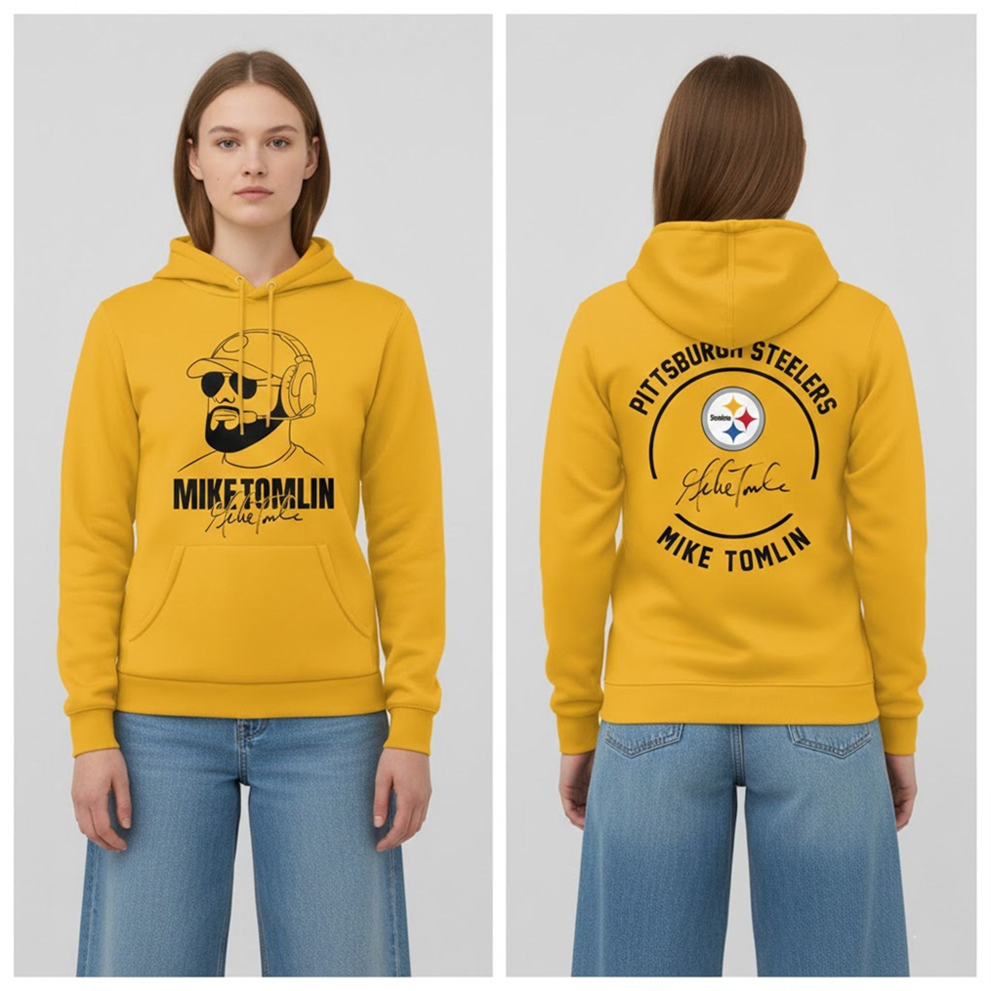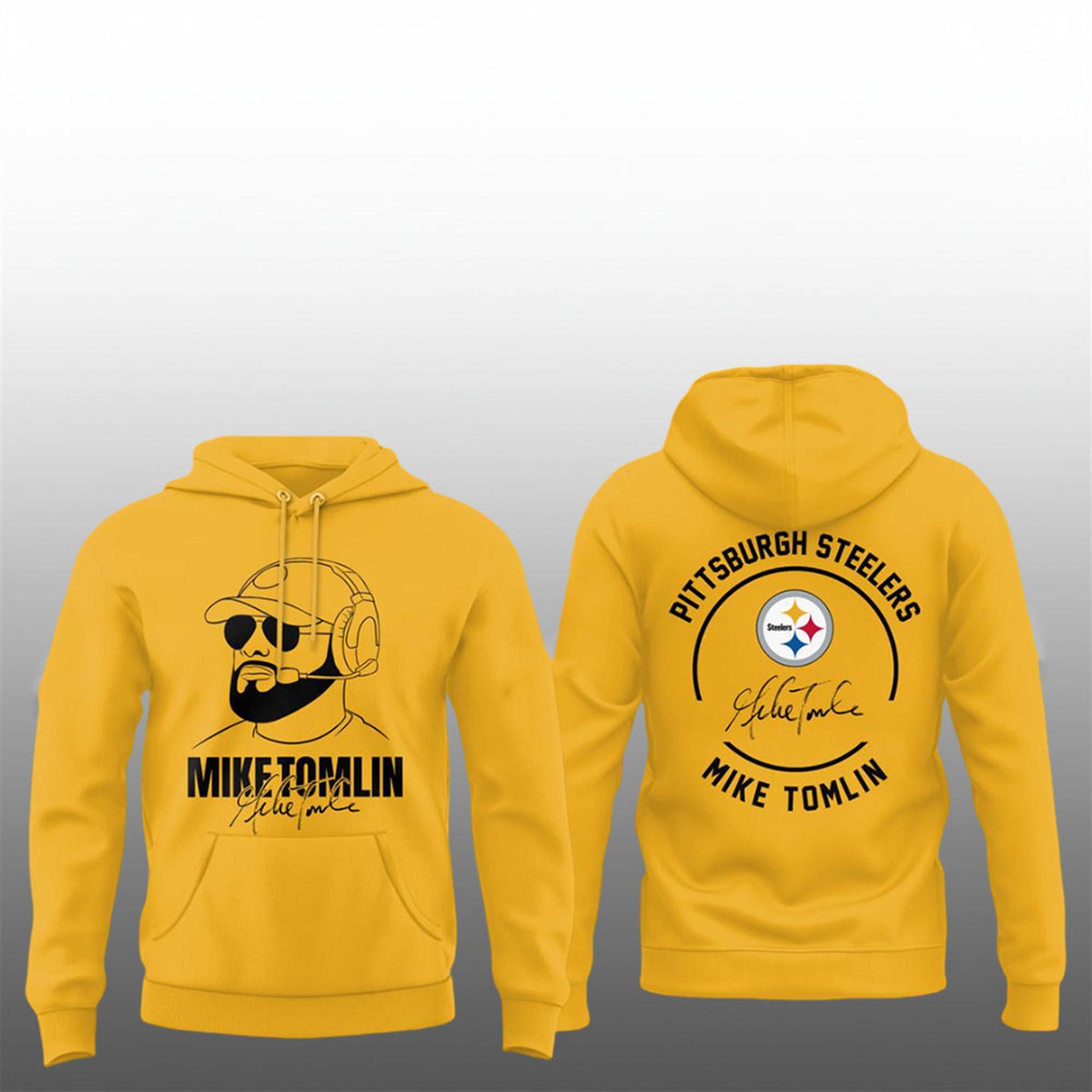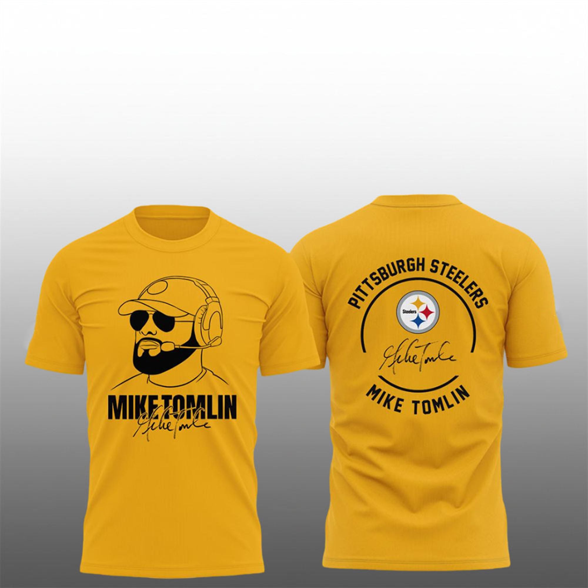 The front of the shirt features a bold, high-contrast graphic of Coach Tomlin donning his signature cap, sunglasses, and headset—a look that struck fear into opponents and instilled confidence in Pittsburgh fans for years. Beneath the portrait lies his name and signature, grounding the design in authenticity. The back of the shirt completes the tribute with the classic “Pittsburgh Steelers” arch text and the team logo, ensuring your allegiance is visible from every angle.