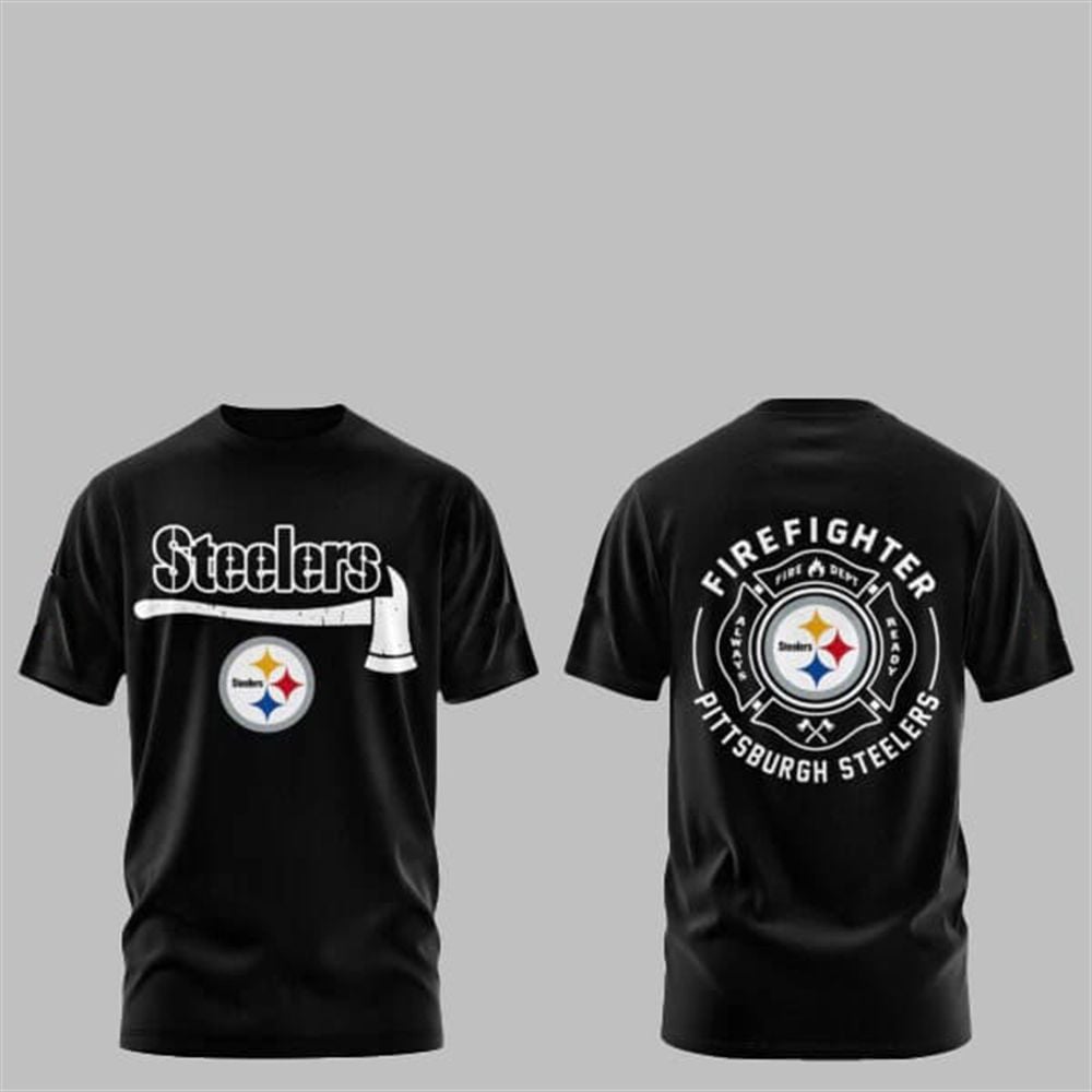 This commemorative shirt boasts a powerful, two-sided design crafted for the ultimate fan and supporter. The front features the iconic “Steelers” wordmark in its classic, powerful font, underlined by a firefighter’s axe—a symbol of readiness and strength. Just below, the beloved Steelers logo shines in its vibrant colors, instantly identifying your allegiance.