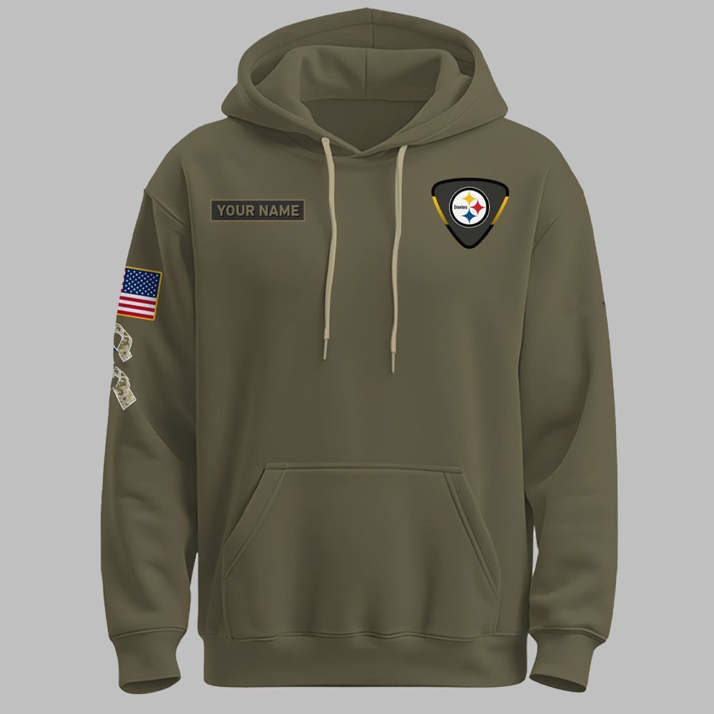 The Pittsburgh Steelers Salute to Service 2025 Hoodie is crafted to stand out. Presented in a classic military-style olive drab green, it immediately evokes a sense of duty and respect. The front of the hoodie features a tactical, shield-shaped patch of the iconic Steelers logo on the left chest, a modern take on a timeless emblem. Positioned opposite is a dedicated hook-and-loop panel, allowing you to add your own customizable name patch for a personalized touch. The right sleeve is adorned with a full-color, embroidered American flag patch, while the left sleeve features additional tribute details, solidifying the hoodie’s patriotic theme and authentic military-inspired design.