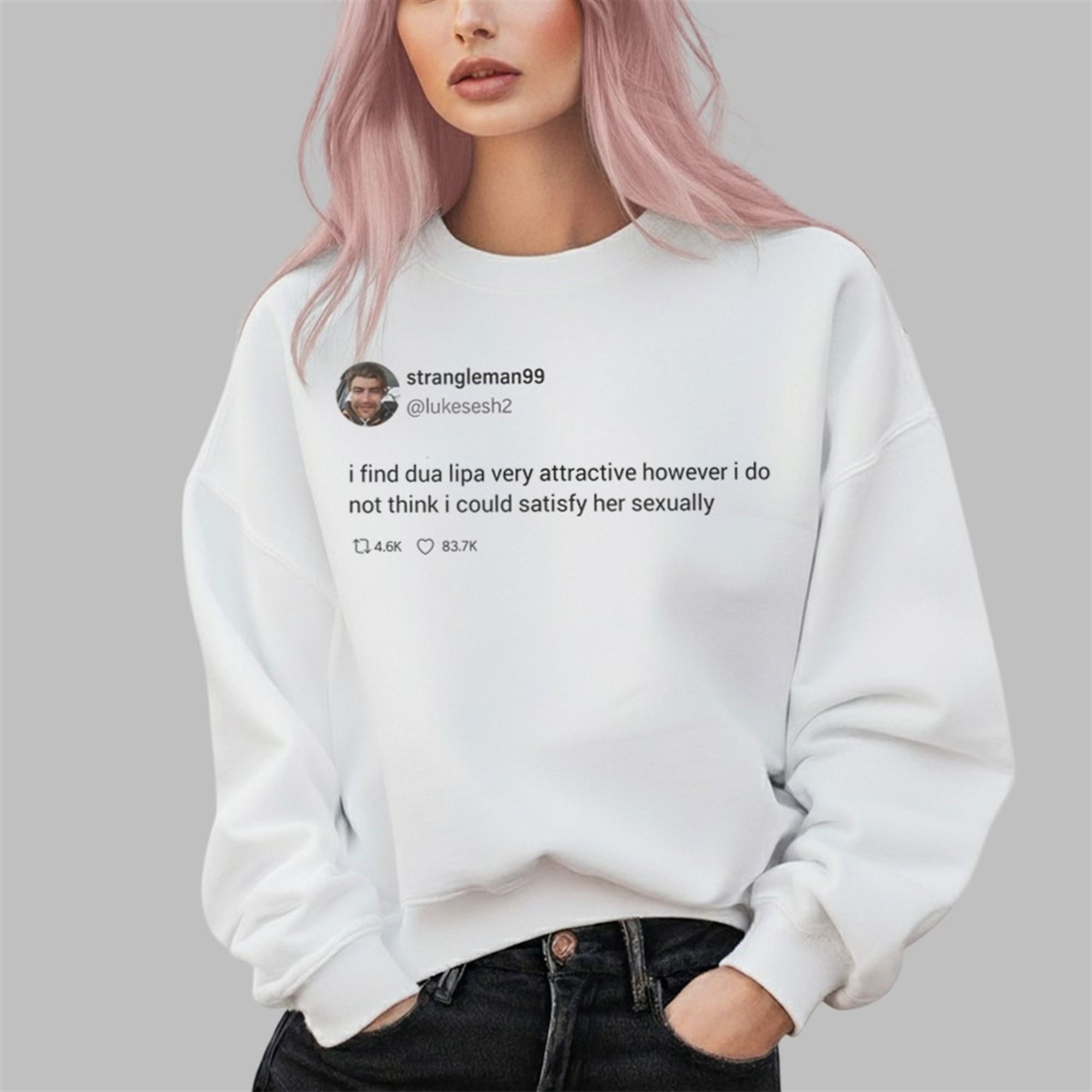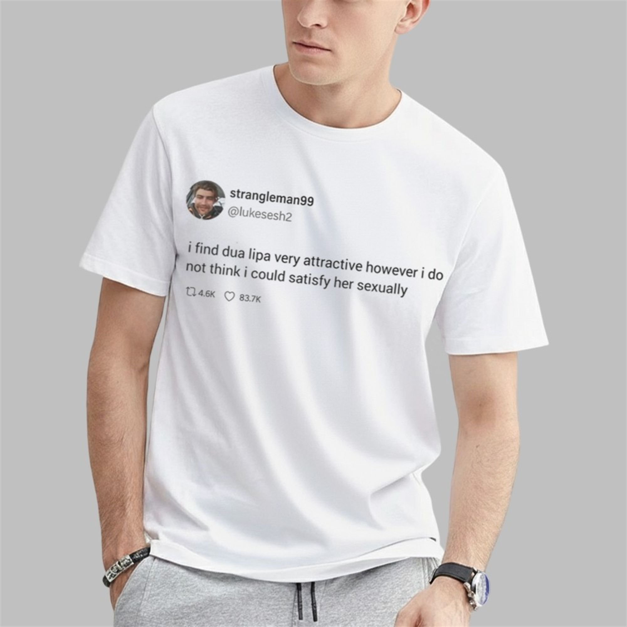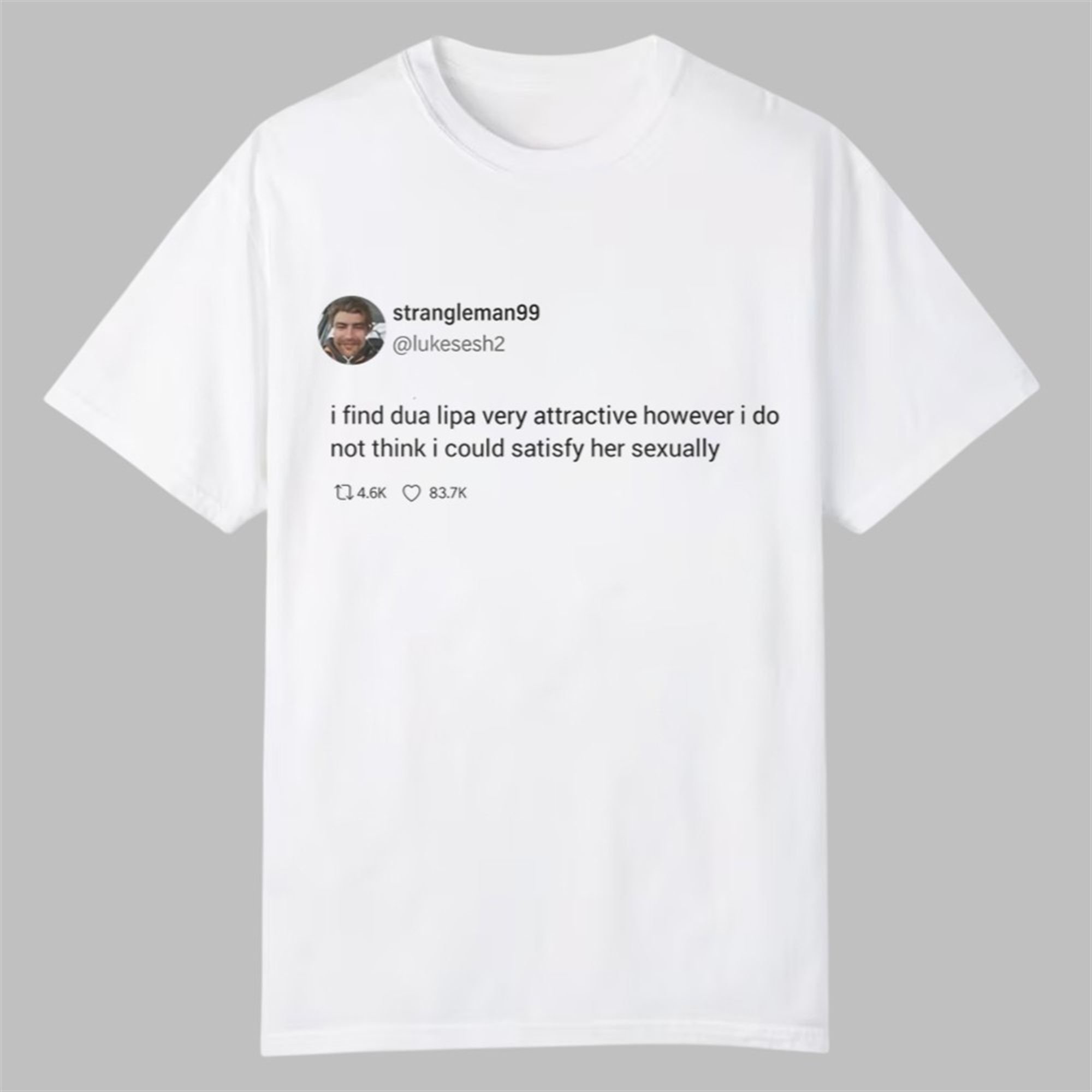 Capture the essence of viral fame with the Strngleman99 “I Find Dua Lipa Very Attractive” Tweet Shirt. This isn’t just another graphic tee; it’s a wearable piece of internet lore. Featuring a high-quality, screen-accurate print of the iconic tweet from user strangleman99 (@lukesesh2), this shirt perfectly encapsulates a moment of comedic gold that resonated across the globe. The tweet, “i find dua lipa very attractive however i do not think i could satisfy her sexually,” became an instant classic for its brilliant mix of profound admiration and hilariously candid self-awareness.