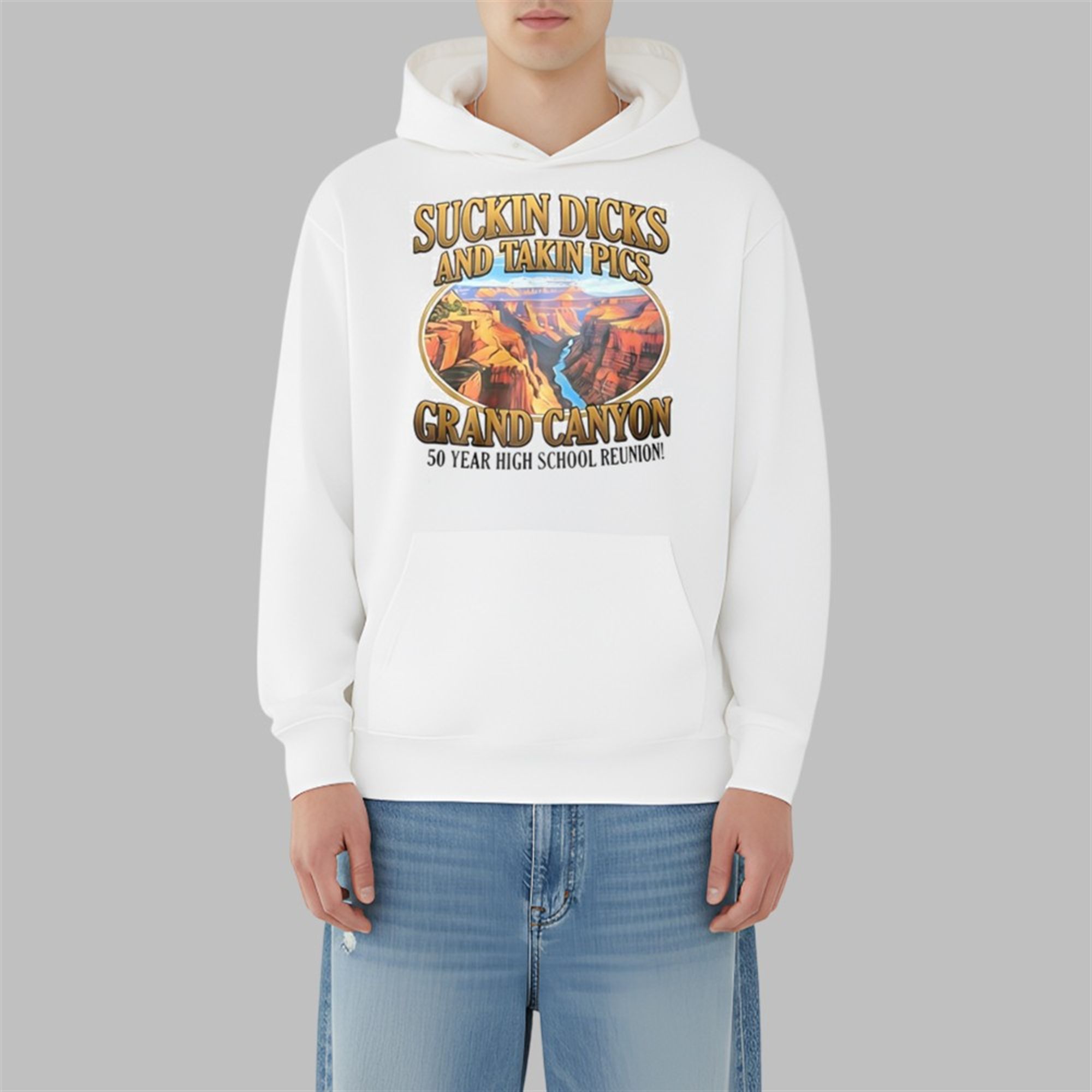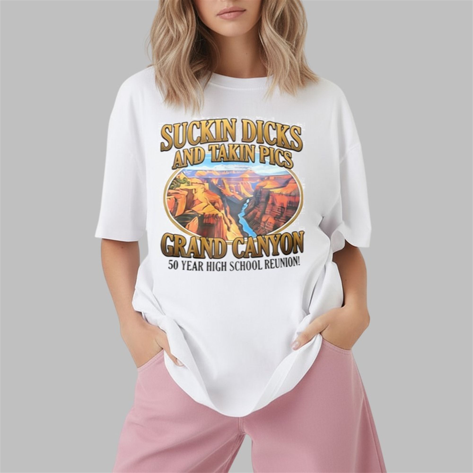 The shirt is a masterclass in “unhinged” nostalgia. The design features a classic, vintage-style oval illustration of the Grand Canyon, complete with its iconic orange rock formations and the winding Colorado River. Surrounding this serene image is the provocative, rhyming slogan “Suckin Dicks and Takin Pics Grand Canyon 50 Year High School Reunion” that has set social media ablaze. It perfectly captures the juxtaposition of a respectable milestone—a 50-year high school reunion—with a wild, unapologetic attitude.