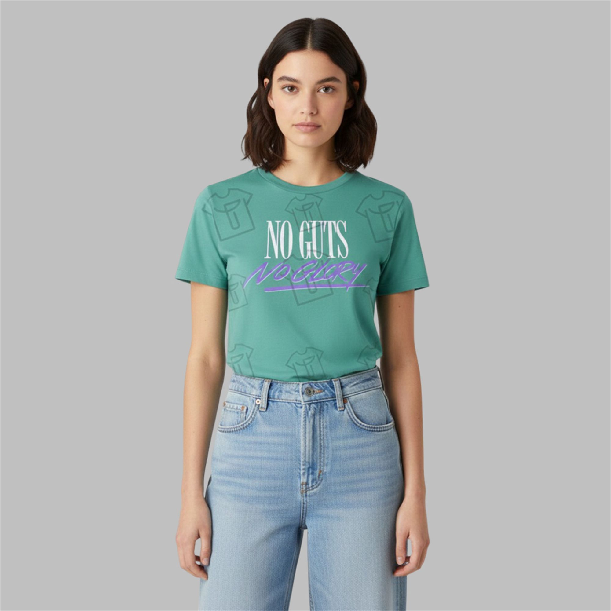 Capture the unapologetic confidence of Hollywood’s “It Girl” with the “No Guts No Glory” Shirt. Recently spotted on the star, this teal graphic tee instantly became a viral sensation, perfectly embodying the 90s athletic-chic revival dominating late 2025 fashion.