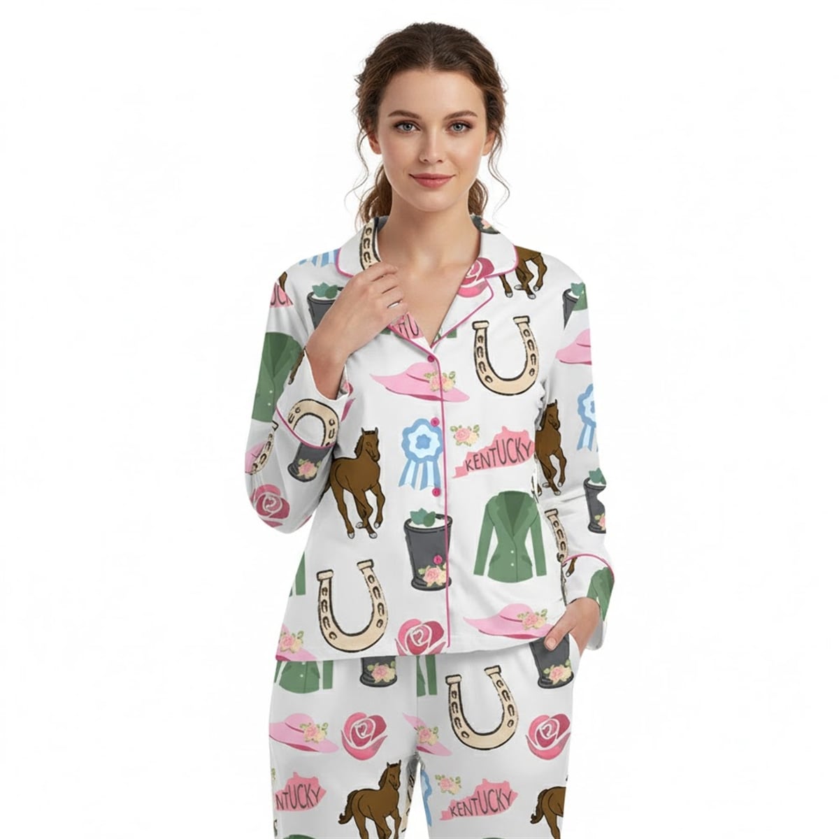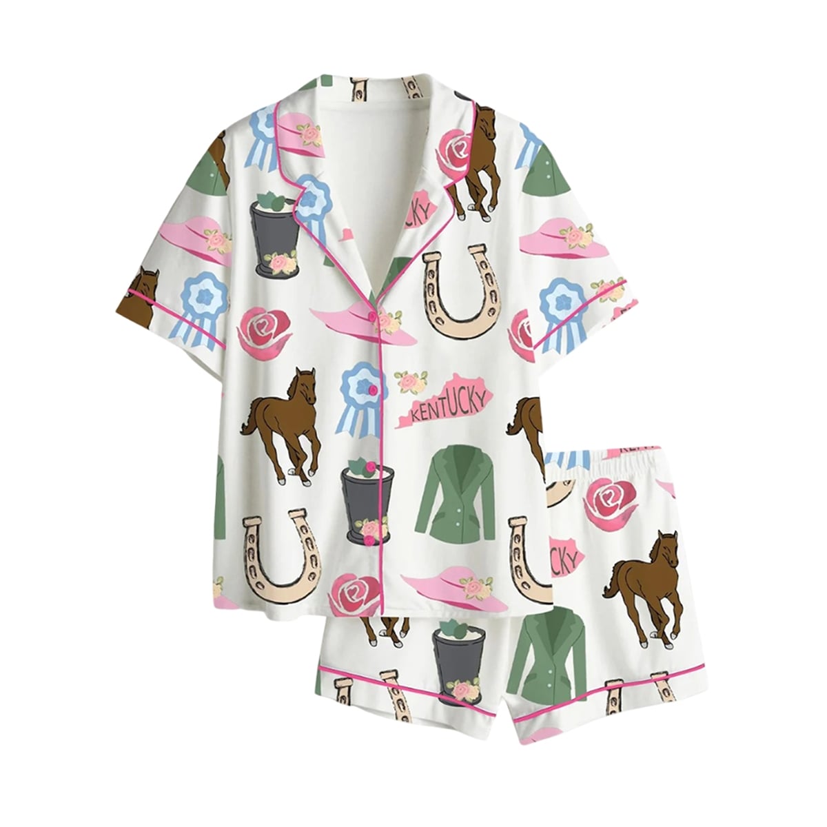 The design of this two-piece set is a masterclass in event-themed storytelling, weaving together the most recognizable hallmarks of the legendary race. The majestic brown thoroughbreds represent the heart, power, and soul of the competition itself. Scattered pink wide-brimmed hats serve as a nod to the extravagant, world-famous fashion that defines the event’s spectator culture. The illustrated silver cups filled with mint juleps symbolize the traditional, refreshing beverage of choice for track attendees. Furthermore, the golden horseshoes bring a touch of customary luck, the blue ribbons signify the ultimate pursuit of first place, and the green riding jackets represent the jockeys’ vibrant silks. United by pink “KENTUCKY” banners and delicate pink piping, these symbols collectively honor the “Run for the Roses” heritage.