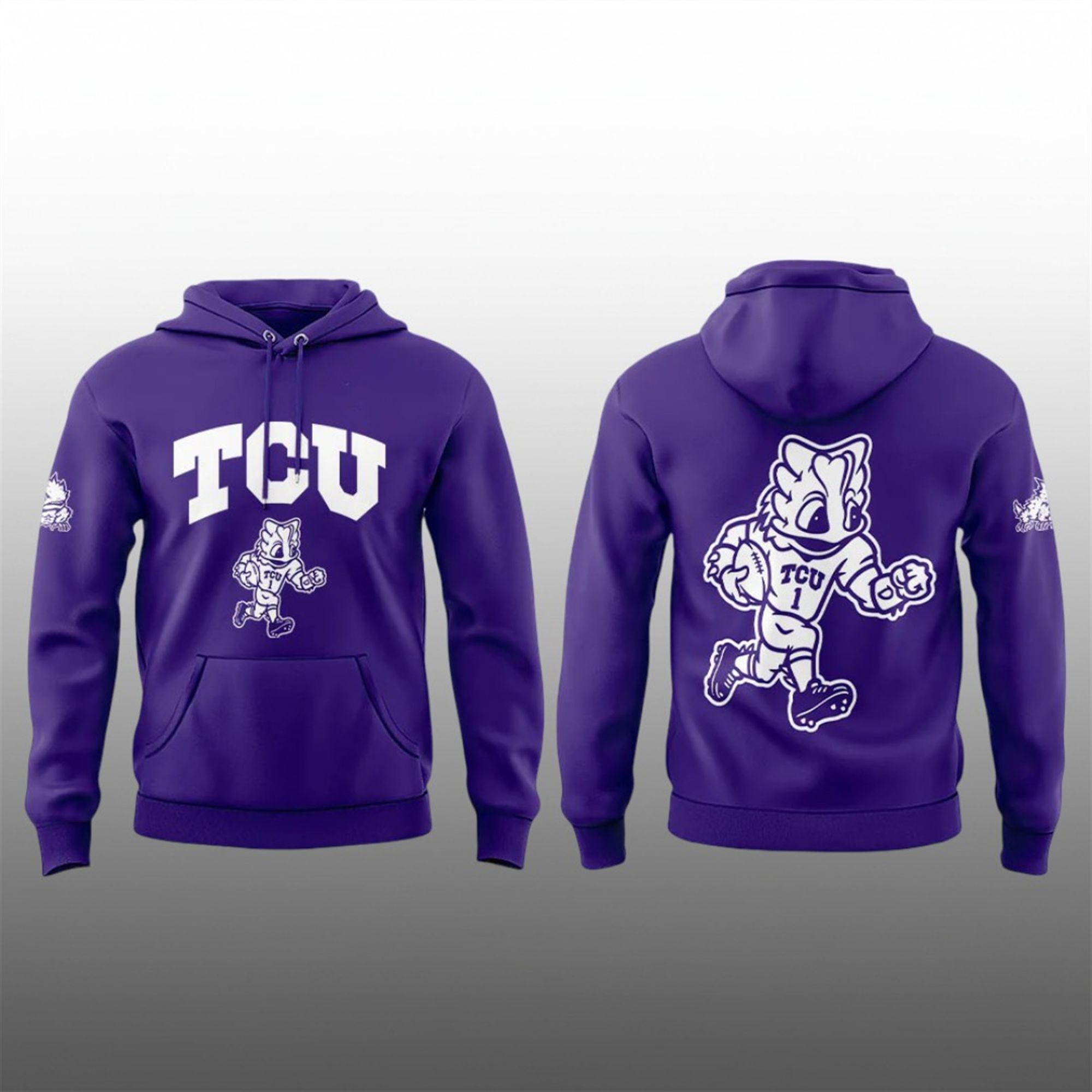 This isn’t just a basic tee; it’s a nod to the golden era of college football. The front features the classic block “TCU” lettering above a retro-styled SuperFrog mascot carrying the rock. The back takes it a step further with an oversized, bold line-art graphic of SuperFrog stiff-arming the competition. The deep TCU purple serves as the perfect canvas for the crisp white graphics, ensuring you stand out in the sea of fans at “The Carter.”