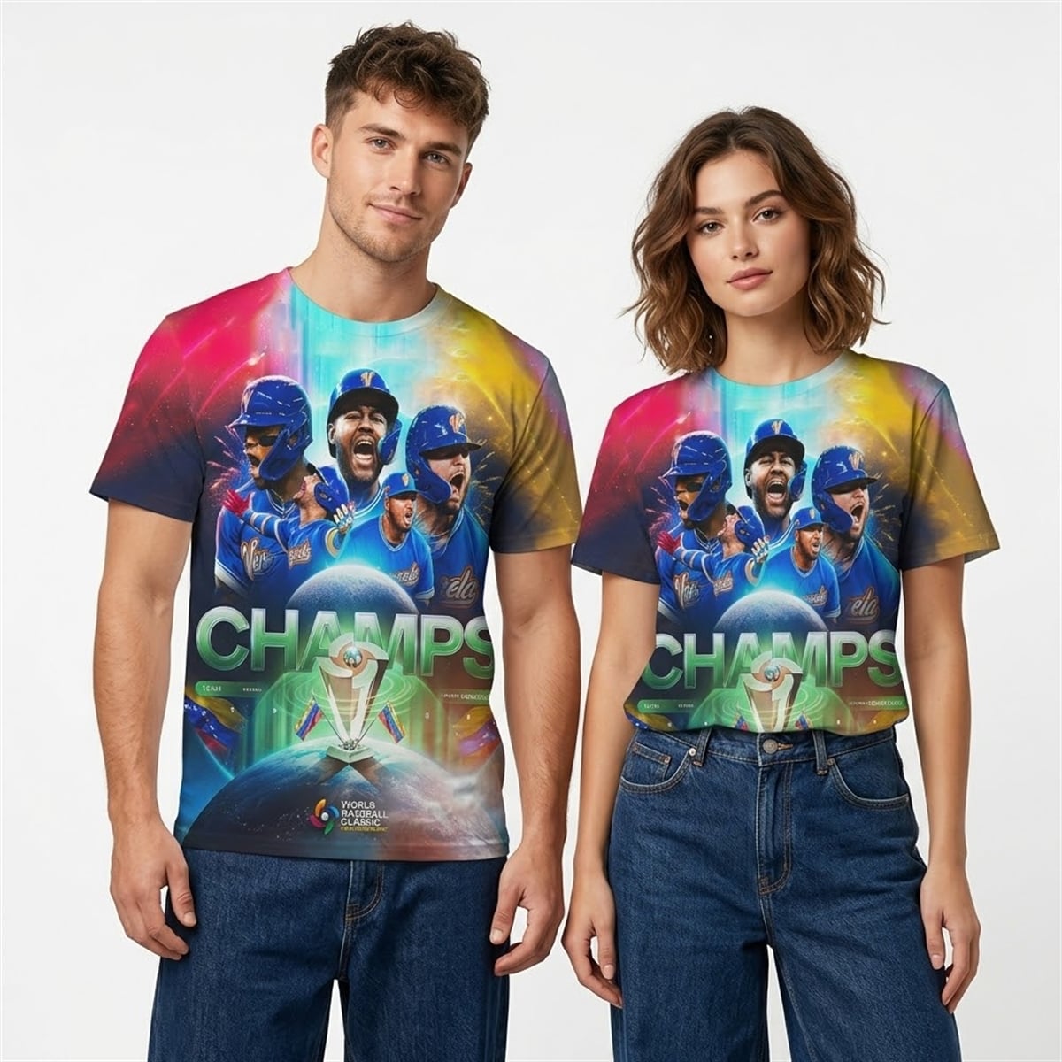 Immerse yourself in the thrill of the game with the shirt. This vibrant, full-print design is a visual masterpiece dedicated to one of the most exciting tournaments in international sports history. Featuring a stunning cosmic background that blends deep blues, radiant pinks, and golden yellows, the aesthetic perfectly captures the explosive energy of the winning team. Prominently displayed across the chest is the word “CHAMPS” in bold, futuristic typography, anchored by the gleaming World Baseball Classic trophy resting atop the globe. Flanked by the proud Venezuelan flag and the 2026 tournament logo, the graphic showcases jubilant players in mid-celebration, forever freezing their triumphant roars and triumphant poses in time.