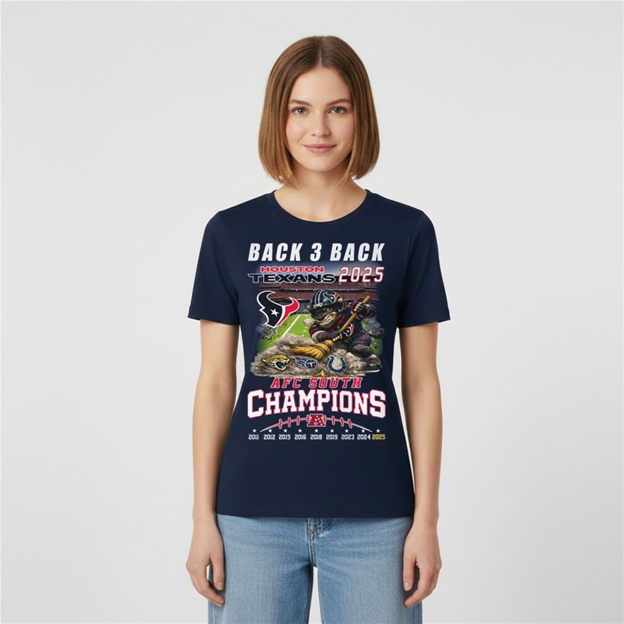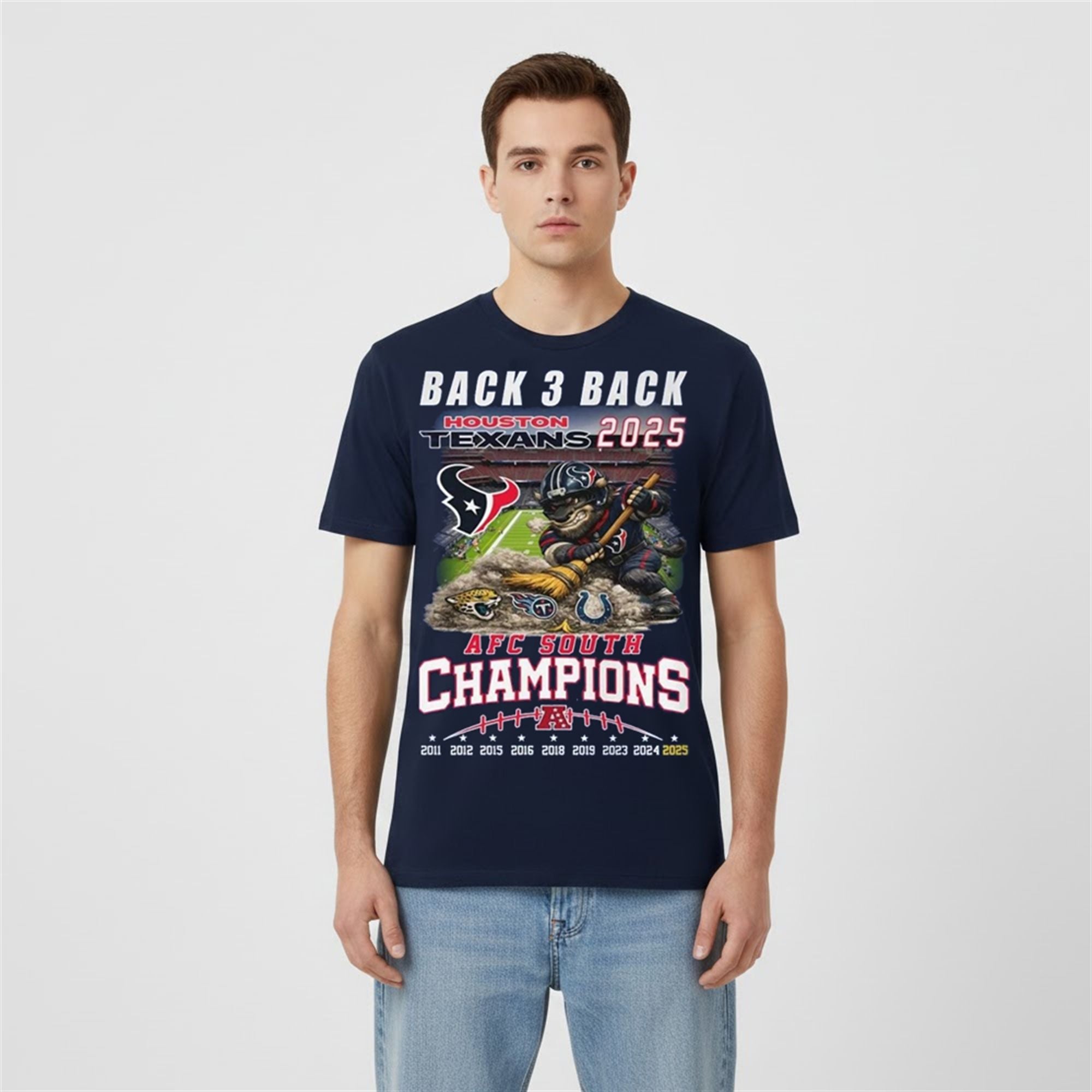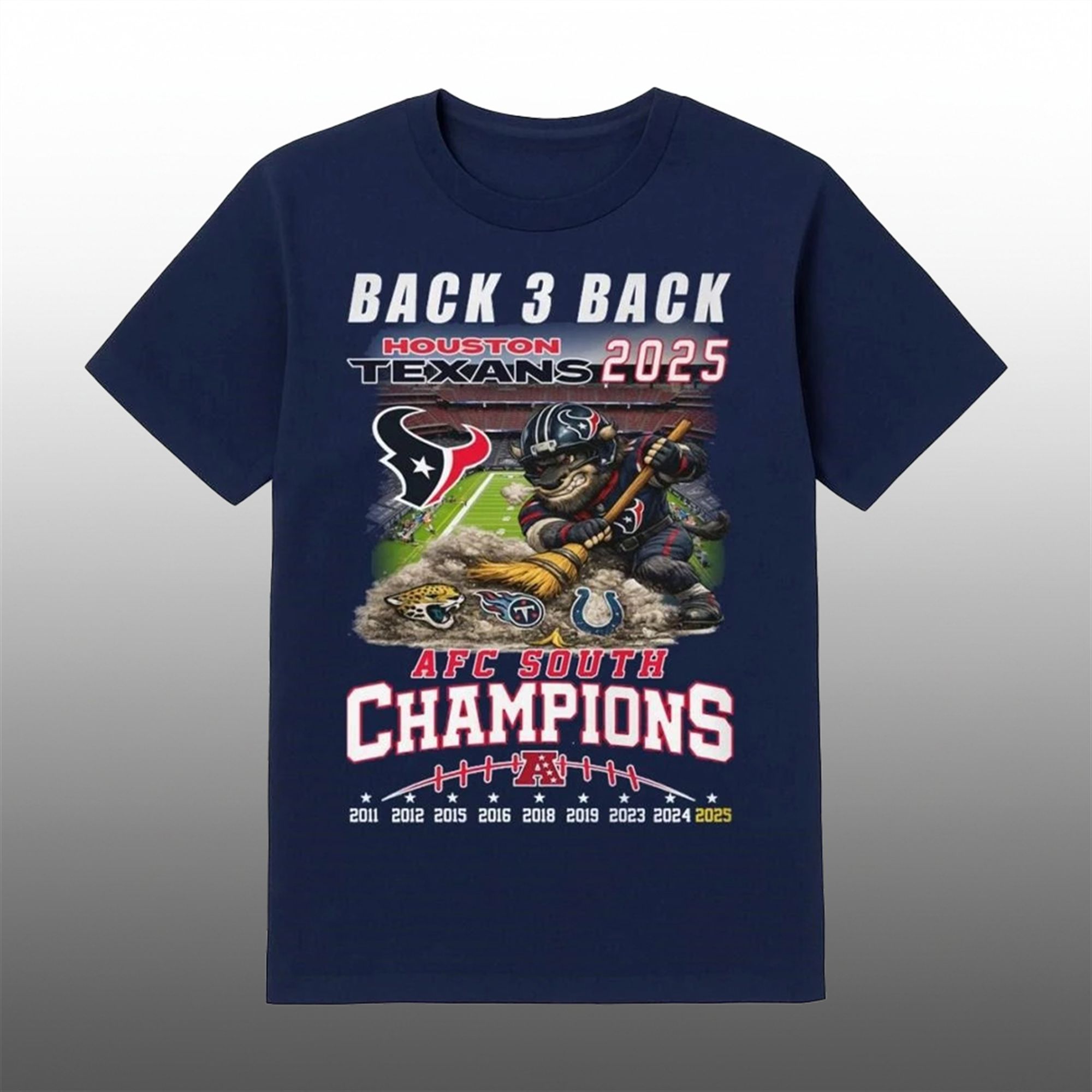 The graphic details are meticulous and deeply satisfying for any Texans fan. In the dust pile being swept away, you can clearly see the discarded logos of the division rivals: the Jacksonville Jaguars, the Tennessee Titans, and the Indianapolis Colts. Above this scene, the bold text “BACK 3 BACK” anchors the design, referencing the consecutive division titles. The bottom of the design serves as a historical receipt, listing every year the Texans have conquered the South: 2011, 2012, 2015, 2016, 2018, 2019, 2023, 2024, and now, 2025. This visual timeline transforms the shirt from simple apparel into a wearable trophy case.