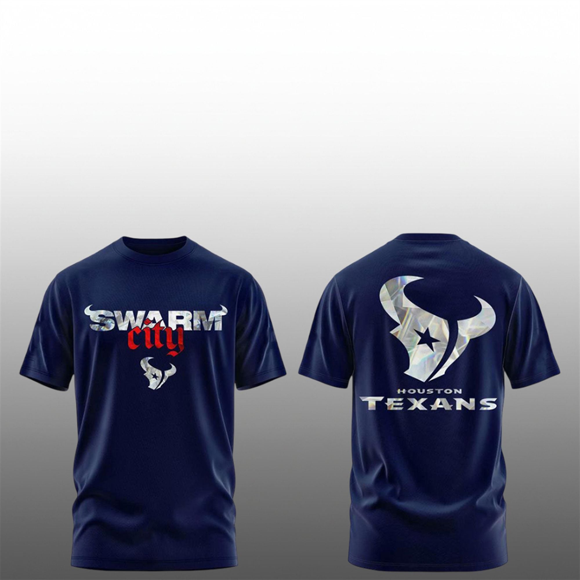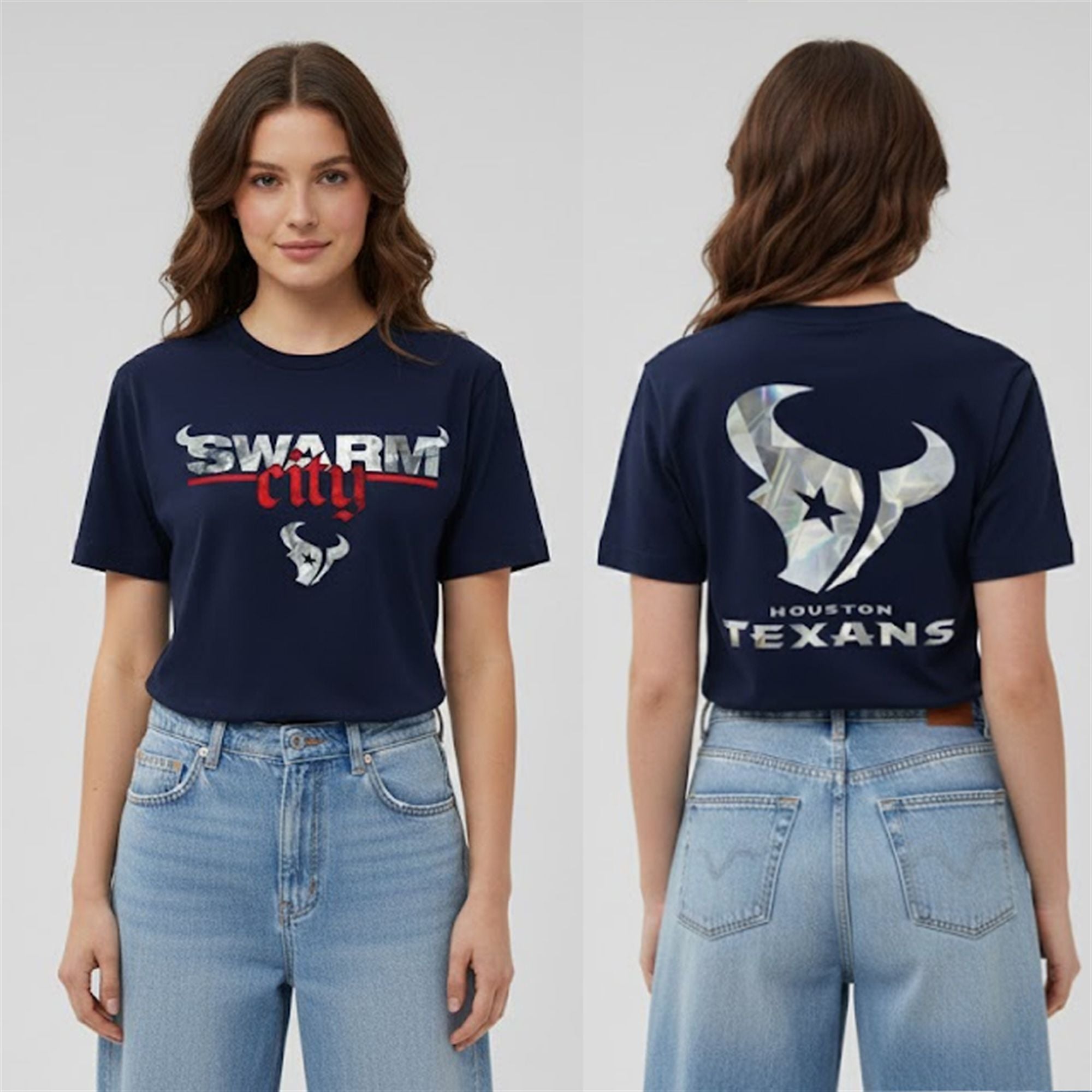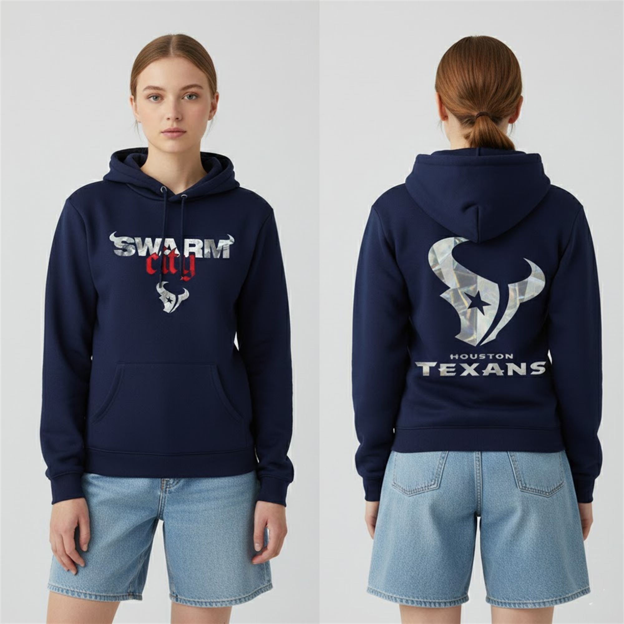 The “Swarm” isn’t just a defensive scheme; it is the cultural heartbeat of the 2025-2026 Houston Texans. This hoodie translates that aggressive, tackle-everything mentality into a visual masterpiece. The front design features the word “SWARM” rendered in a metallic, diamond-cut texture that mimics the look of high-end jewelry, contrasting sharply against the deep navy background. Below it, “City” is scripted in a gothic, Old English red font—a direct nod to traditional streetwear and hip-hop typography that resonates deeply with Houston’s urban identity.