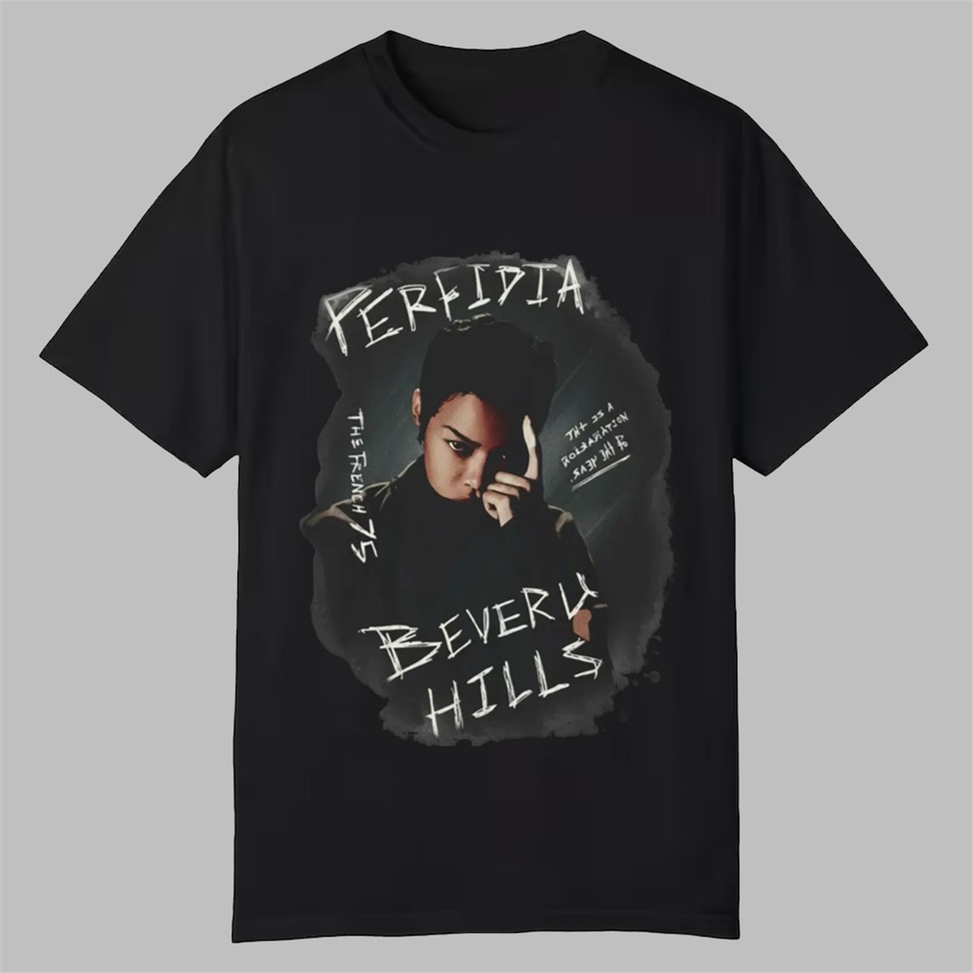 Surrounding this captivating image is bold, expressive script that adds to the shirt’s artistic narrative. The words “PERFIDIA” and “BEVERLY HILLS” anchor the design, creating a moody, location-based story. This is complemented by smaller, intriguing details like “THE FRENCH 75” and the handwritten “THIS IS A REPRESENTATION SHOW ‘MIR'” woven into the artwork. These elements invite interpretation and elevate the tee from simple apparel to a true collector’s piece.