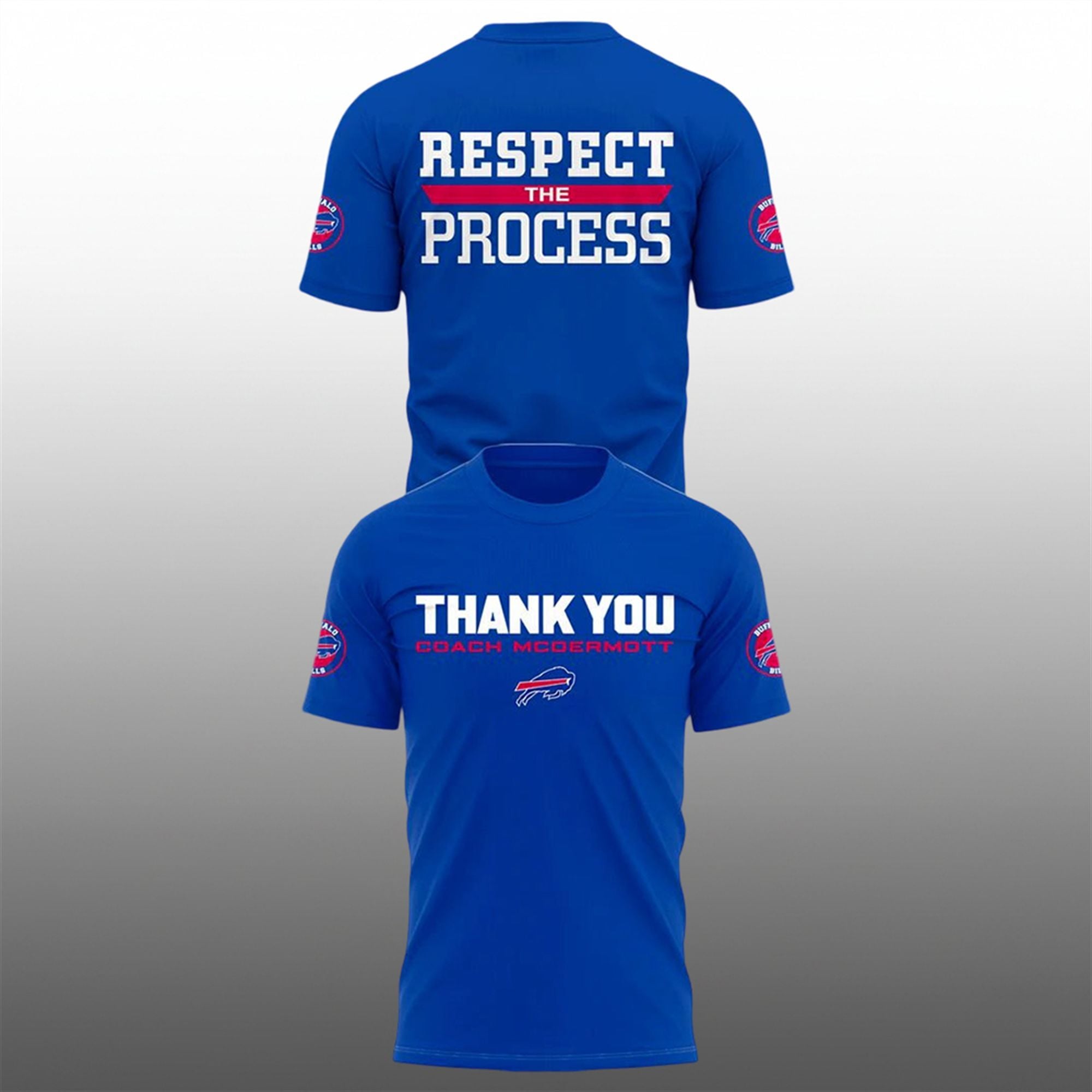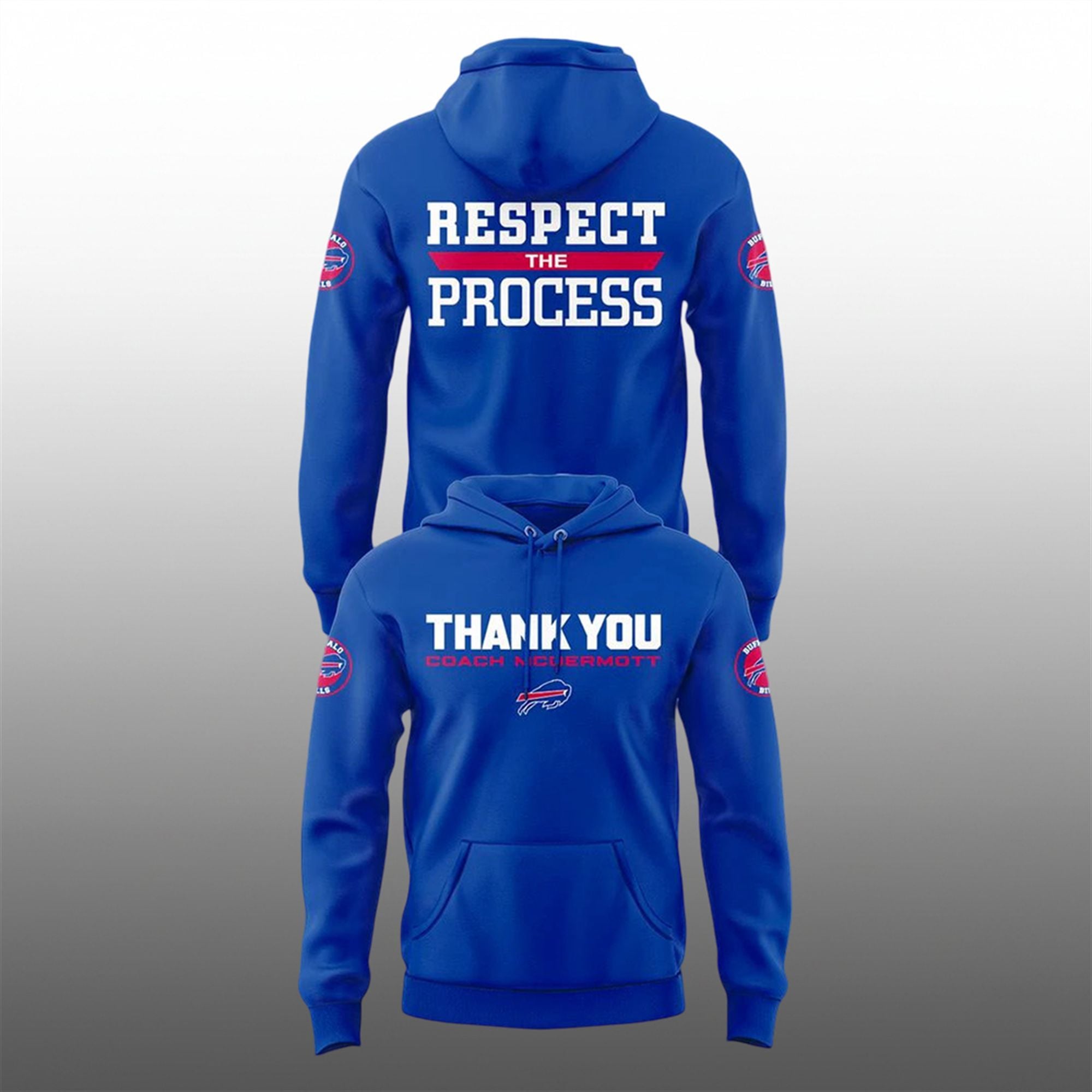 This hoodie is more than merchandise; it is a piece of storytelling. The design specifically highlights two distinct messages that resonate deeply with the Buffalo fanbase. On the front, “Thank You Coach McDermott” sits proudly above the team logo, offering a direct message of gratitude to the head coach who transformed the team’s identity. On the reverse, the massive “RESPECT THE PROCESS” text serves as a rallying cry, reminding everyone behind you that success is earned, not given.