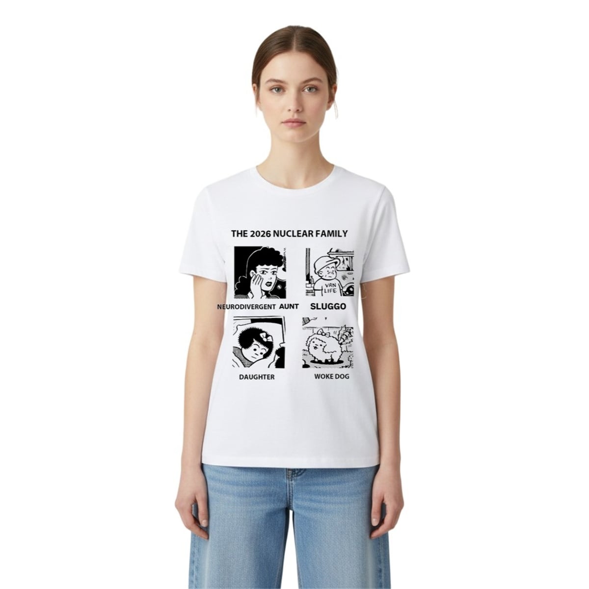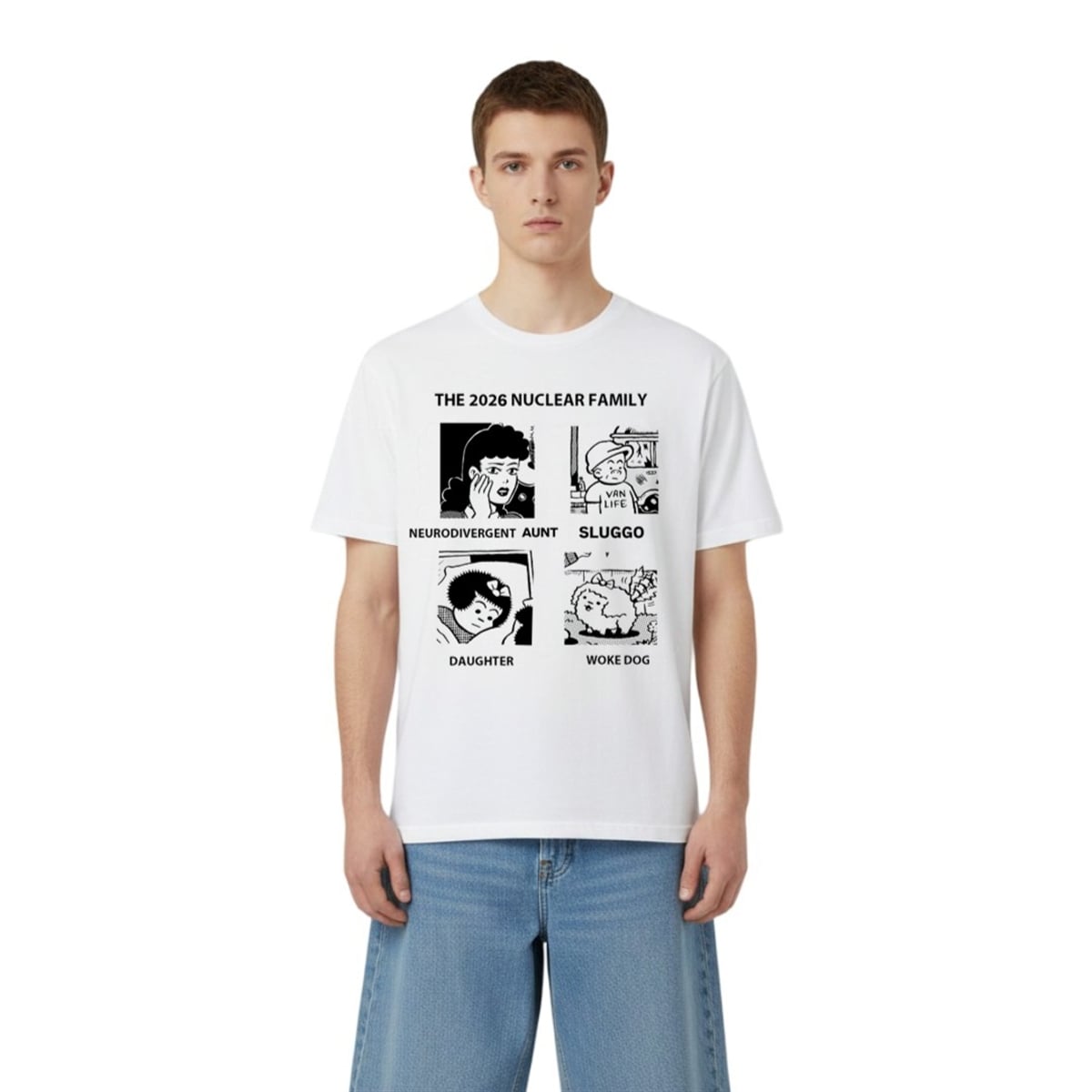The shirt features a stark, high-contrast black-and-white graphic divided into four neat, square panels, mimicking the Sunday funnies of the 1950s. However, the text tells a very different story. Under the overarching title “THE 2026 NUCLEAR FAMILY,” the design introduces four highly unconventional family members.