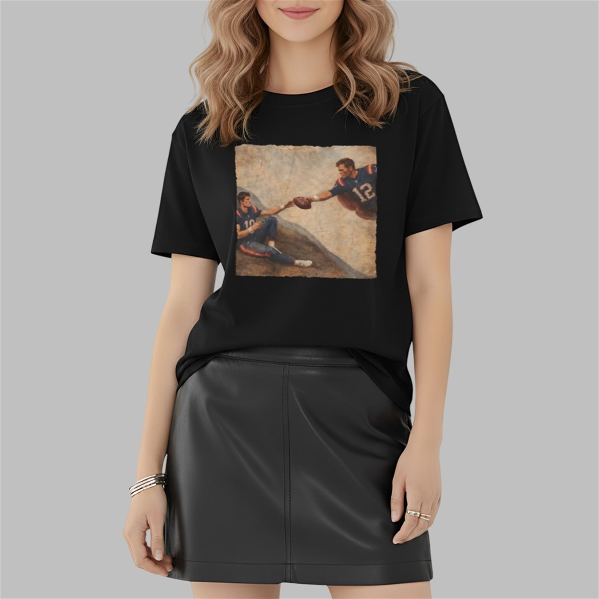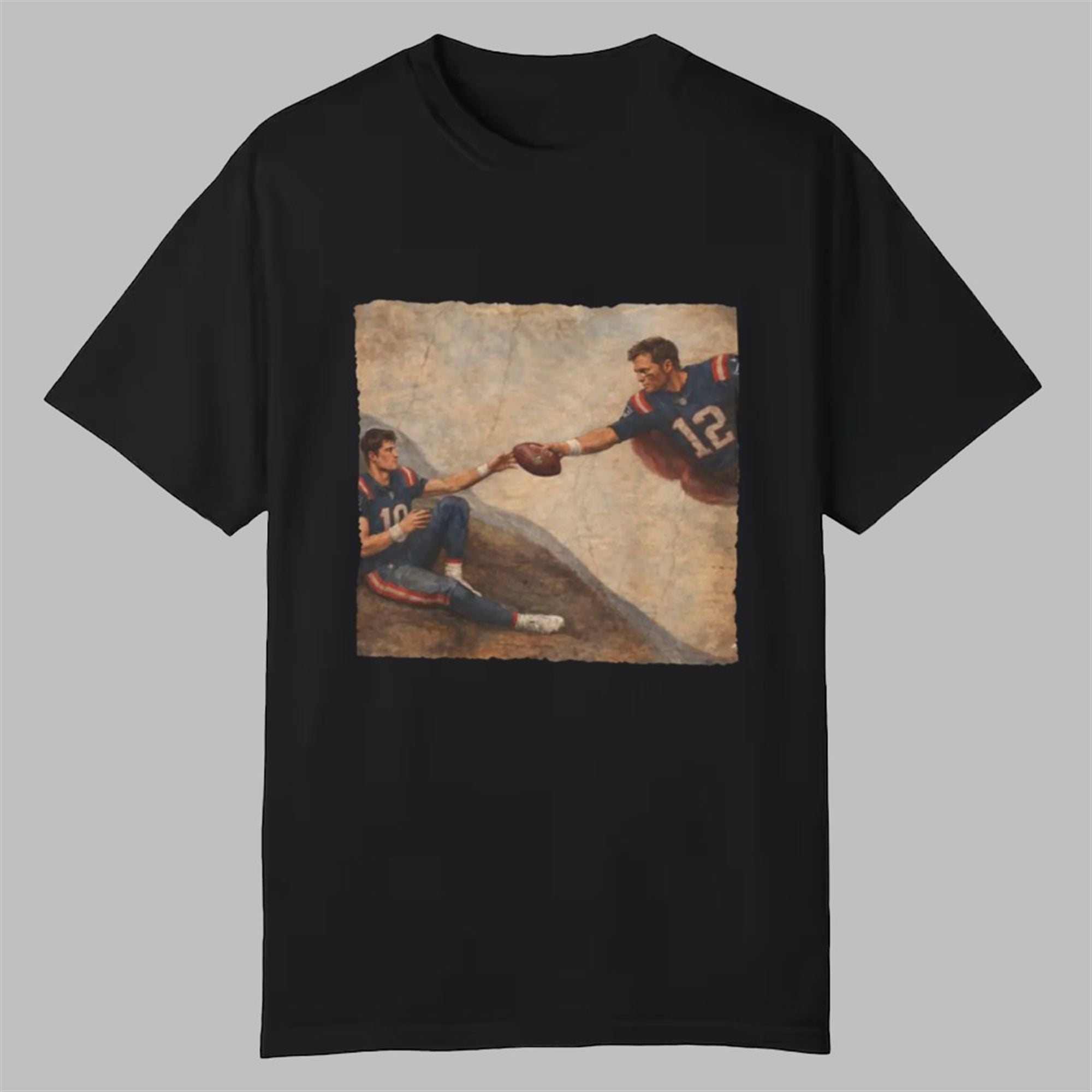 In the world of New England sports, the quarterback position is treated with near-religious significance. This shirt taps directly into that cultural fervor by parodying Michelangelo’s famous The Creation of Adam fresco from the Sistine Chapel. However, instead of a biblical scene, we witness a distinct football mythology: The “God” figure is represented by the legendary Tom Brady (wearing his iconic #12), stretching out from the heavens. Reaching back is the young savior of the franchise, Drake Maye (donning #10), ready to receive not the spark of life, but the pigskin itself.