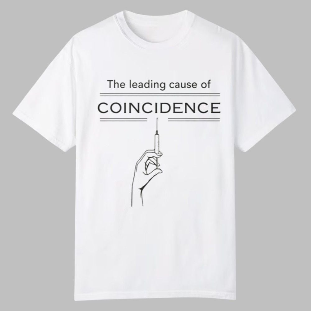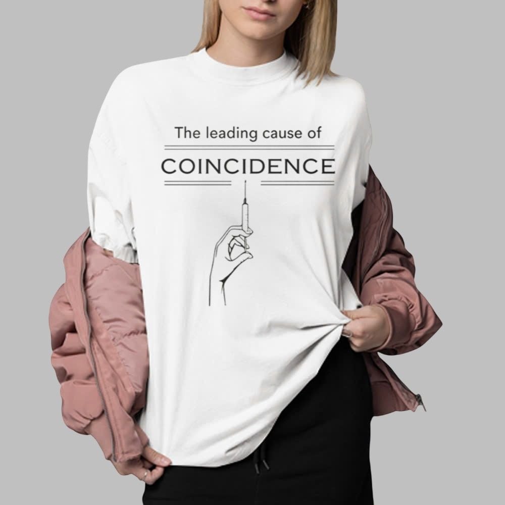 The bold, capitalized text “COINCIDENCE” is framed by the impactful phrase “The leading cause of,” drawing immediate attention to its message. Below the text, a clean line-art graphic of a hand holding a syringe completes the thought-provoking design, leaving its interpretation open to the discerning mind. This tee is expertly crafted for those who value freedom of thought, appreciate sardonic humor, and aren’t afraid to showcase their inquisitive nature. It’s the perfect uniform for the critical thinker, the data analyst, and the perpetually curious individual who knows that correlation sometimes deserves a closer look.