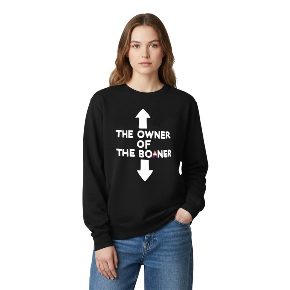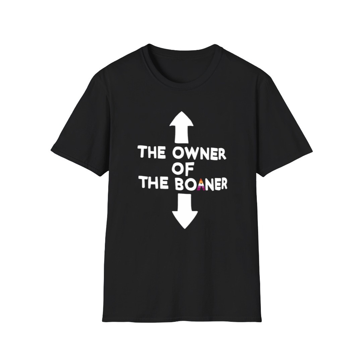 At first glance, the text “THE OWNER OF THE BOANER” reads as a bizarre, humorous slang phrase. However, the true brilliance of the design lies in its nuanced visual details. The upward-pointing arrow sits directly above the word “OWNER,” playfully indicating the person wearing the shirt. The downward-pointing arrow adds a layer of suggestive, comedic emphasis.