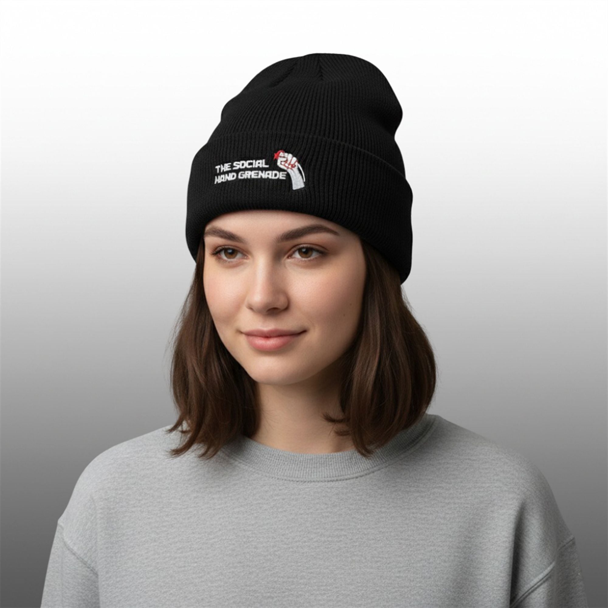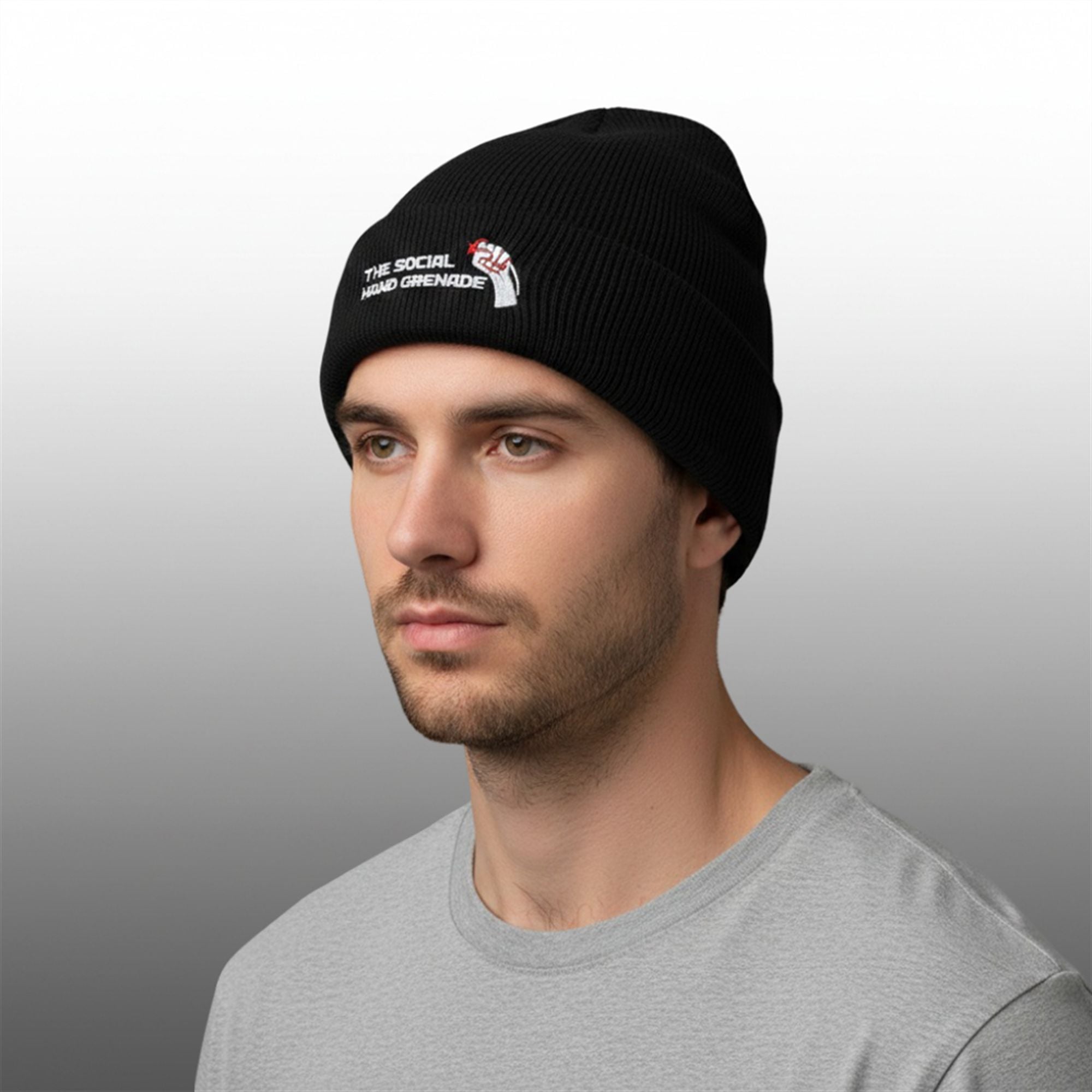 The beanie is a masterclass in visual storytelling. It utilizes a classic, deep black canvas to highlight the stark white text, ensuring the message “THE SOCIAL HAND GRENADE” is legible from across the room. The accompanying graphic—a clenched fist gripping a grenade with a distinct red pin—adds a pop of aggressive color that draws the eye immediately.